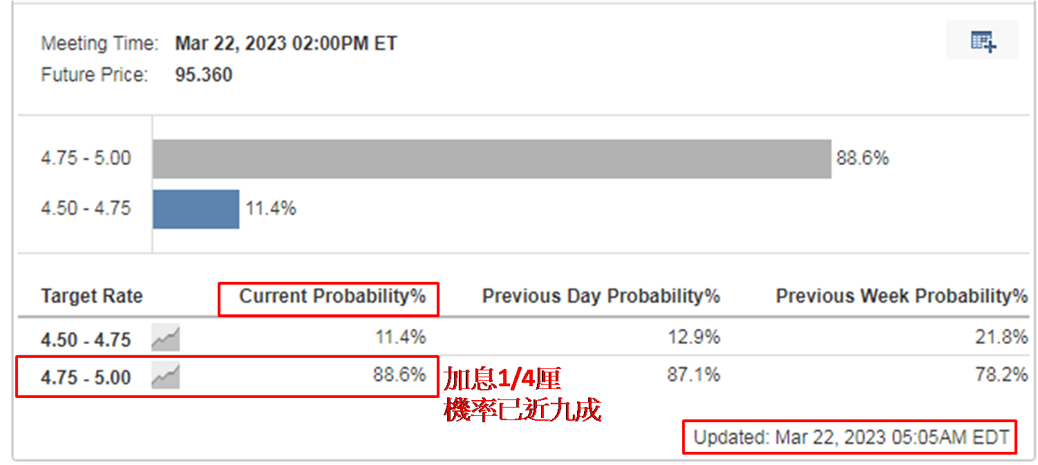 倘若集资失败,最坏情况是出售全部业务偿债,此举无异于宣布清盘,笔者预期届时美国联邦存款保险公司 (FDIC) 继硅谷银行 (SIVB.US) 和Signature Bank (SBNY.US) 后再出手接管。暂时硅谷银行未见有私营机构愿意「接盘」,倘若卖盘失败,最终要将业务进行拆骨式拍卖,业务一般会被「贱卖」,那么必然出现债务违约,为环球金融市场带来振荡。此外,本周焦点还有香港时间3月23日凌晨2:00美国联储局公布议息结果,加息1/4厘机率高近九成,大家需要在留加息后股市走向,道指要见连续两天收高于33,000点,才可望摆脱阴霾。