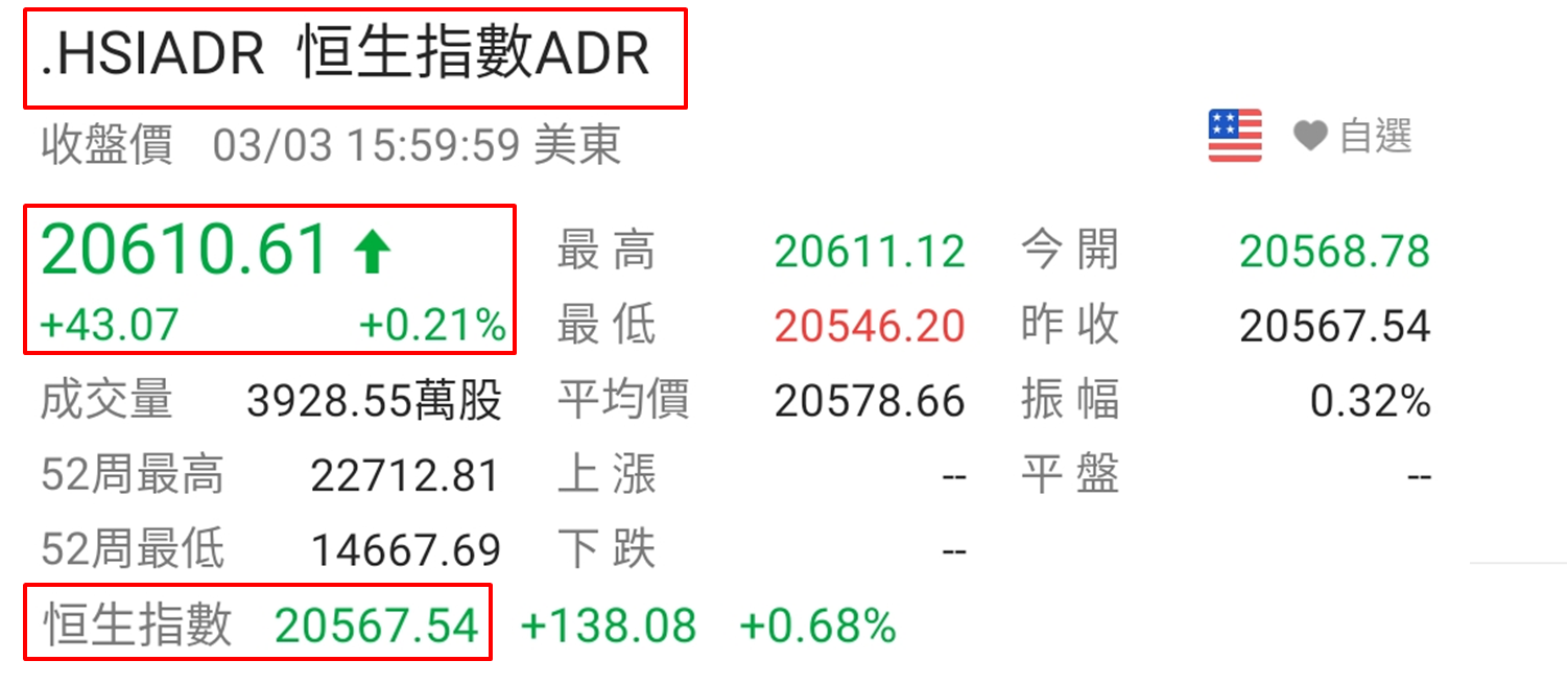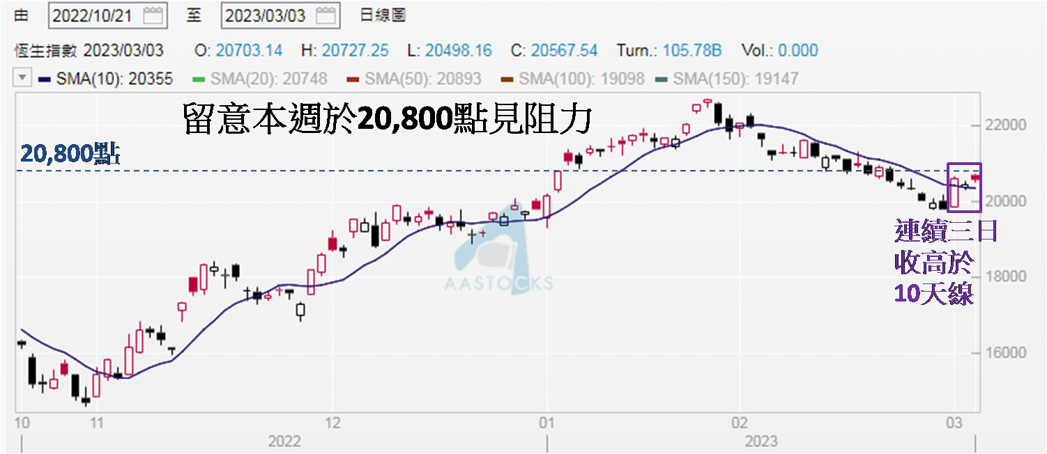 前文末又指出美股道指已失守250天线 (见于2月28日),慎防港股表现短期会否被美股拖后腿。而于3月1至3日,道指却见三连升,250天线失而复得,3月3日收报33,390点,较250天线为32,667点高出723点,亦见连续两天收高于33,000点心理关口,本周美股有望靠稳。若外围未有为港股带来沽压,理应港股有力续升,但应留意3月3日道指、标指和纳指分别上升1.17%、1.61%和1.97%,面对美股明显造好,香港时间截至周末 (3月4日) 凌晨3:00夜期收市时,上述三项指数已升0.85%、1.29%和1.67%,港股夜期仅收报20,669点,上升95点,升幅为0.46%,表现未见显著受惠于美股升势。