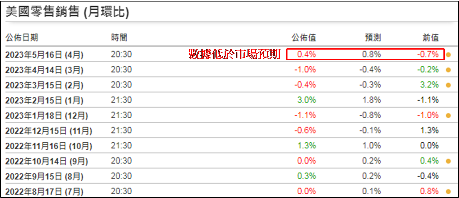 观乎周二道指已逼近33,000点收市,意味着本周恒指能否守住19,500点水平变量大,现时港股欠缺利好消息,而外围则见负面消息不绝。周二公布的4月份美国零售销售数据,环比增长0.4%,虽高于前值的 -0.7%,却低于市场预期的0.8% (如下图),连续三个月公布数字,均低于市场预期,加上现属上市公司今年首季公布业绩旺季,同日公布季绩的美化家居用品零售商家得宝 (HD.US),销售额同比下降4.2%至约372.57亿美元,低于市场预期约382.80亿美元;管理层亦下调集团于2023财政年度全年销售预期,将较2022财年倒退2.0%至5.0% (此前预期为大致持平)。