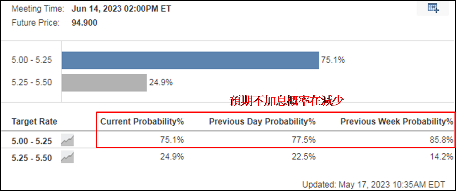表面看来上述消息未见影响科技股表现,笔者认为是市场憧憬美国快要结束加息周期使然。不过利率期货反映联储局于6月不加息的概率由一周前的85.8%,降至现于75.1%,也低于上日的77.5% (如下图)。相信若于不削减财政开支而成功调高债务上限,白宫会因希望摆脱经济衰退而积极用钱,通胀将再次出现升温压力,可见美国快要结束加息周期或许言之尚早,亦意味着美国科技股随时见大幅调整的风险不少。去年8月22日以来,纳指均收低于12,500点,所以若多看一周,未见纳指突破此水平,若持有美国科技股届时考虑减持或离场为佳。