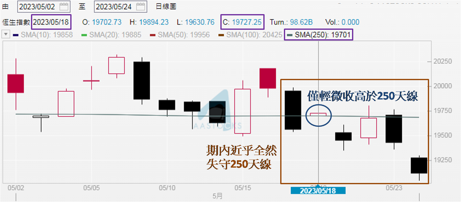 另可留意昨日恒指收市位较19,000点只差约100点,技术走势而言5月底前失收机会大,自5月17日起,便受制于市场称为牛熊分界线的250天移动平均线。至5月24日共六个交易日,只有5月18日收高于此线;不过当日收报19,727点,较此线处于19,701点 (如下图),仅高26点,参考性极低,而其后于5月22日收报19,678点,低于此线为19,696点,相距少于20点,隐若见恒指上扬乏力,故此紧接见二连跌不足为奇。恒指的牛熊线被市场视为枯荣分界,现于其下多日,证明港股走势偏弱,与近日美股表现不谋而合。