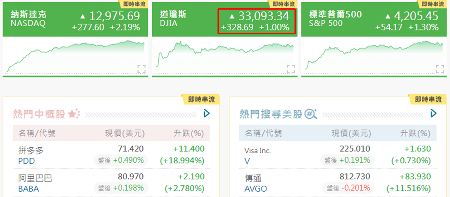 上周五美股造好,但道指表现为三项主要指数中较逊色,升约1.00%,上升328点,勉强重上33,000点水平,收报33,093点 (如下图)。美股造好主因是美国提高债务上限有新消息,其中财长耶伦表示债务上限最后期限由6月1日延至6月5日,意味着白宫和国会领袖有稍长一点时间协商。此外,有报导指双方就着未来两年提高联邦政府债务上限,以及为大部分联邦财政开支设定上限接近达成协议,有指最终协议只会列明政府在住房、教育等不同领域的财政开支额度,但不会进一步细分,并且目前双方认可的开支额度仅约700亿美元差距。