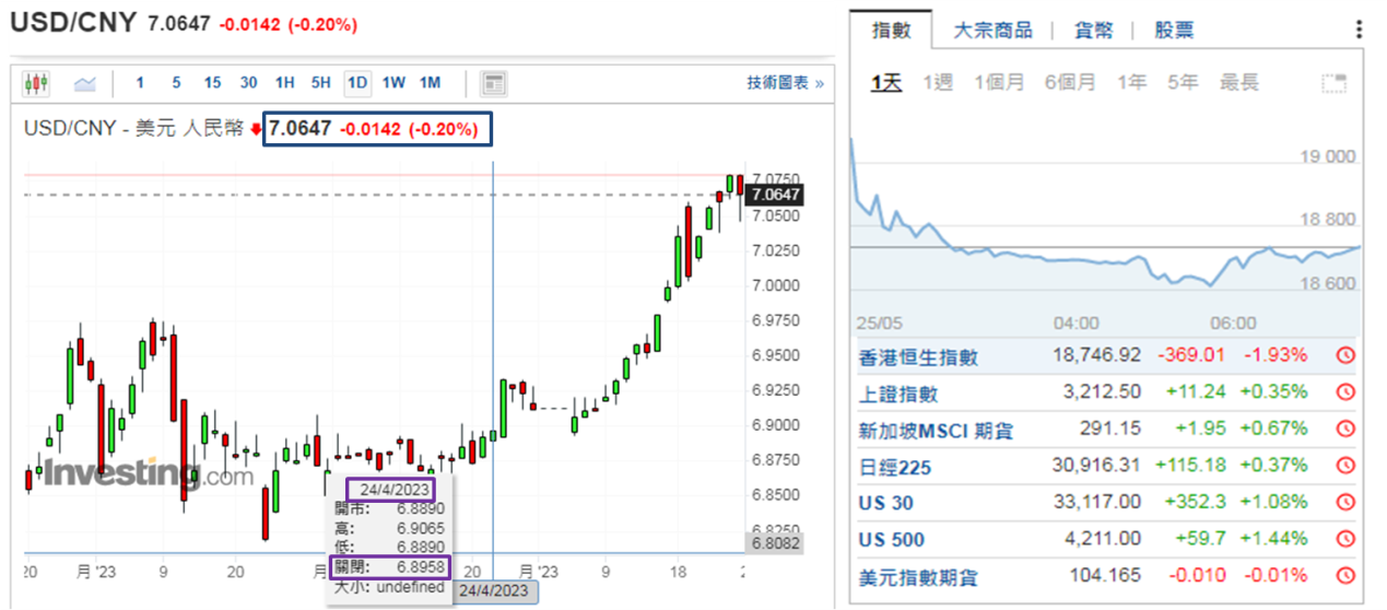 回看港股,美股道指回暖虽为港股喘定带来助力;但更直接左右港股表现近期应关注美元兑人民币走势,单以人民币在岸价而论,年初至5月17日均收低于「七算」,并于3月13日至4月24日超过一个月更收低于6.9000。不过自4月25日起,人民币贬值压力渐见明显,以4月24日收报6.8958 (如下图) 与5月18日收报7.0350比较,不足一个月人民币已贬值近2.00%,并见贬值幅度仍在扩大,于5月25和26日美元兑人民币分别高见7.0793和7.0798,逼近7.0800水平。5月26日虽收报7.0647,人民币贬值情况略见改善;但要见连续两天收在7.0500或以下,才可确认人民币走势真正回稳。