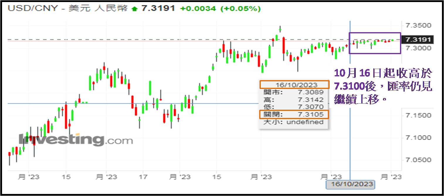 笔者认为人民币走向继续左右11月港股表现,自10月16日起美元兑人民币在岸价已升穿7.3100收市 (如下图),至10月底的半个月日子,除了10月24日收报7.3090,其余日子均收高于7.3100。香港时间截至11月1日中午12:00报7.3190,逼近7.3200,反映在过去半个月,人民币在弱势下仍见兑美元进一步贬值,正好道出为何期内港股偏软。值得留意2022年人民币最弱之时,于11月1日报7.3285,去年却未尝收于7.3200或以上。今年暂见9月7和8日收高于7.3200,分别报7.3287和7.3430,证明2023年自9月起,人民币走势较去年的还要弱。