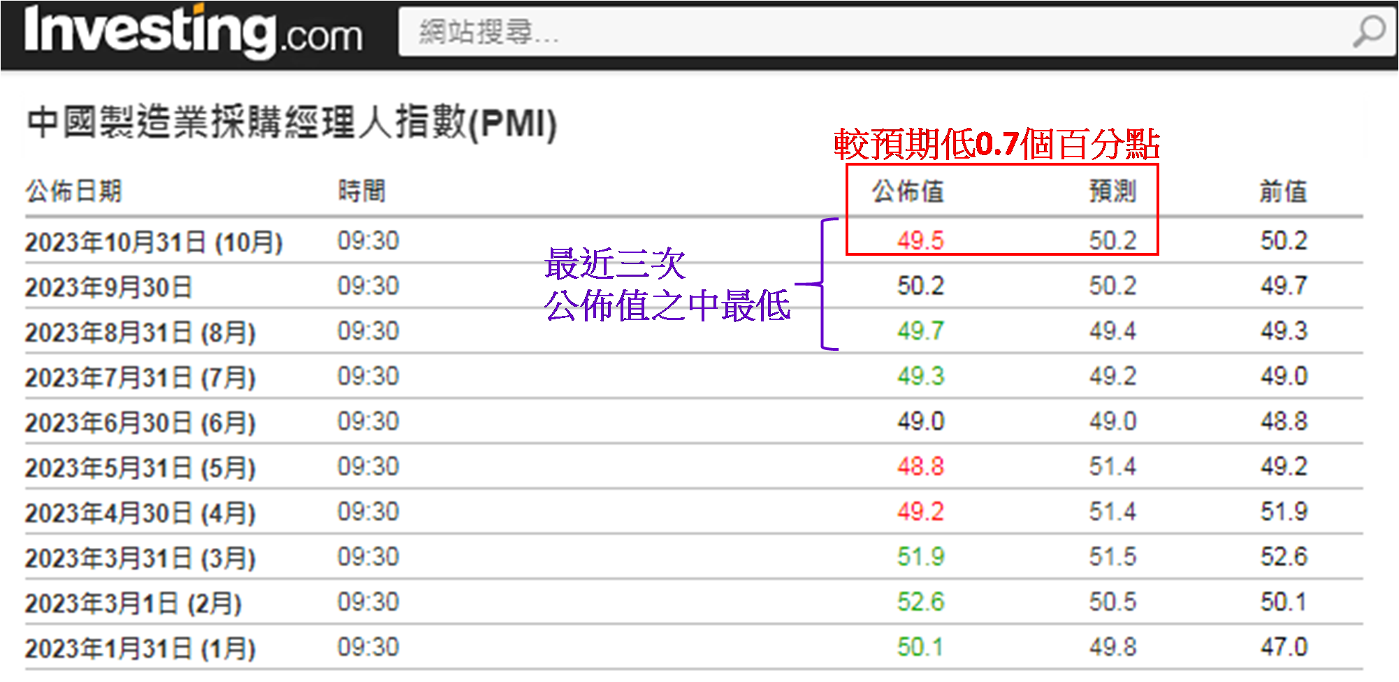 而于周二 (10月31日) 上午9:30公布的内地10月份官方制造业采购经理指数 (PMI) 为49.5,差过市场预期的50.2,亦低于9月份的50.2 (如下图),市场解读低于50反映制造业在收缩。另见今年6月至9月公布值都在上升,如今是四连升止步,并且今次公布值是最近三次之中最低,加深市场对内地经济增长放缓的忧虑。除了PMI,10月多项公布的主要经济数据,包括CPI、PPI和固定资产投资,均逊市场预期。而PMI的意义在于过去四个月表现向好,于内地主要经济数据中,惟一持续向好的,如今亦见转弱。