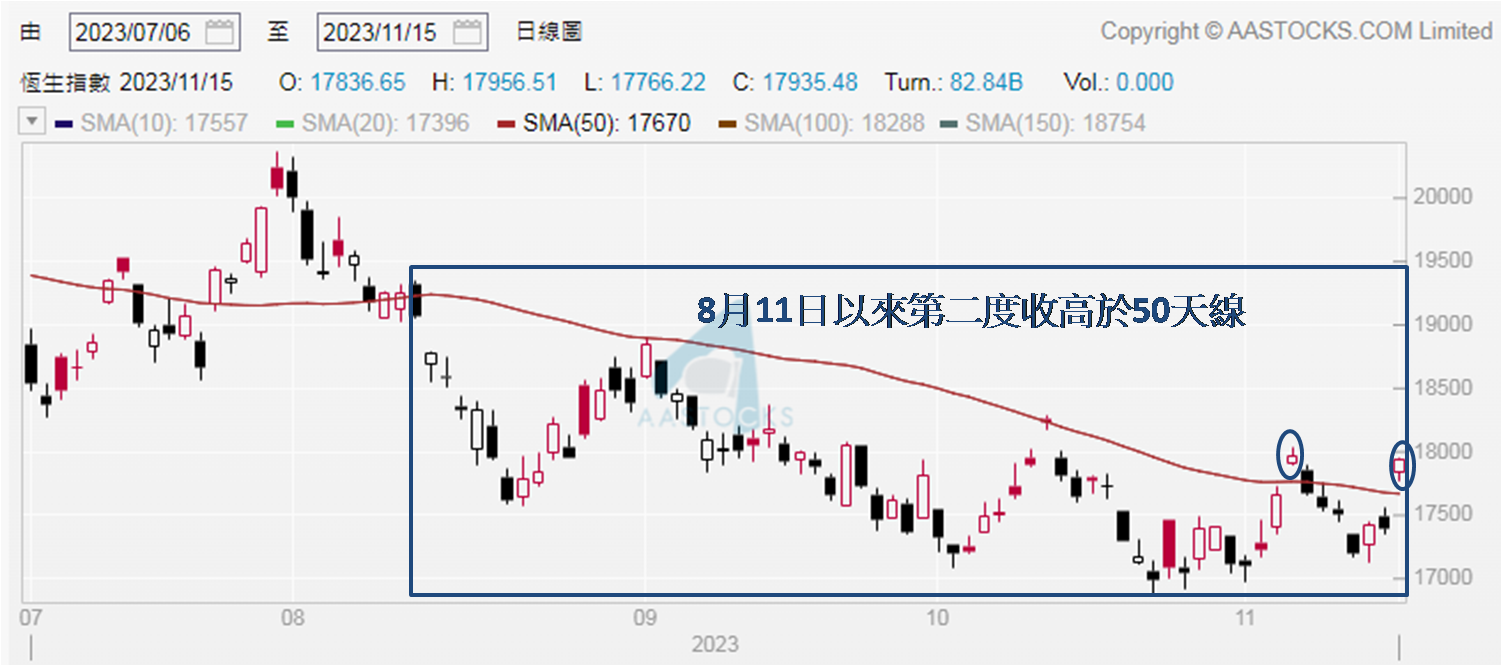 港股表现亦见受惠,同日夜期大升456点,收报17,858点,昨日恒指走势相若,高开近440点后,大部分时间保持在17,800点之上,继11月6日后再度上破50天移动平均线。值得留意8月11日以来,未尝见连续两日或以上收高于此线,所以今日港股继续造好,便是超过三个月的罕见港股荣景,视为有力续升讯号。另想指出昨日上午恒指收报17,888点,较50天线于17,669点高出219点;而11月6日恒指收报17,966点,较此线当时于17,766点高出200点,两次差距相若,再次来到港股由弱转强的关键时刻。