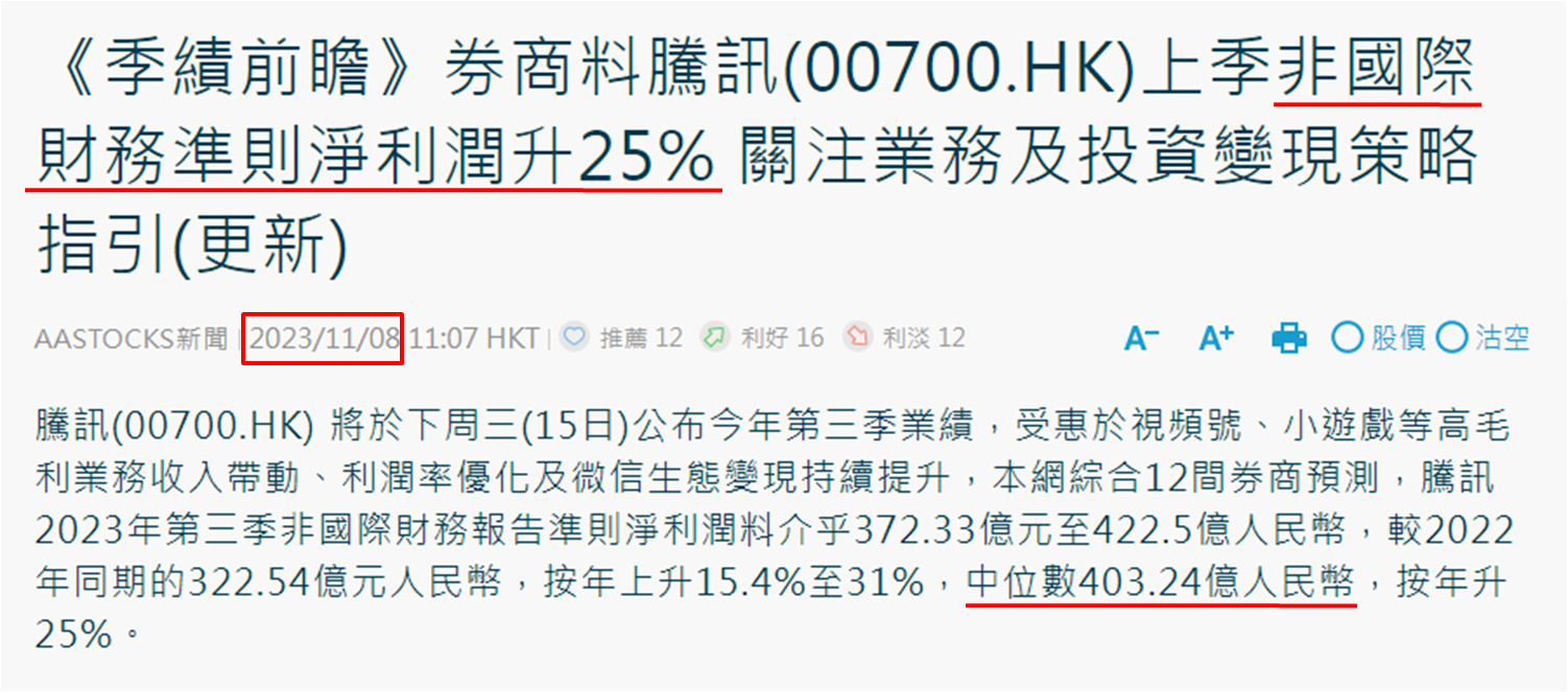 不足800亿元反映当时普遍投资者入市态度审慎,笔者认为成交额至少连续三个交易日高于900亿元,方能确认普遍投资者对港股心态经已转变,毕竟昨日港股表现强势,成交额大增不足为奇;但后续两个交易日才见真章。近期市场焦点还有大型科技股季绩及中期业绩表现,截至昨日上午收市,科指的30只成份股有29只见升和1只无起跌,认为除了前一晚美国科技股大升因素,市场亦憧憬不少大型科技股第三季业绩录得良好增长势态。例如现于恒指第二大权重的腾讯控股 (0700),截至11月8日有媒体综合12间券商预测,第三季非国际财务报告准则净利润中位数增长达25.00%。