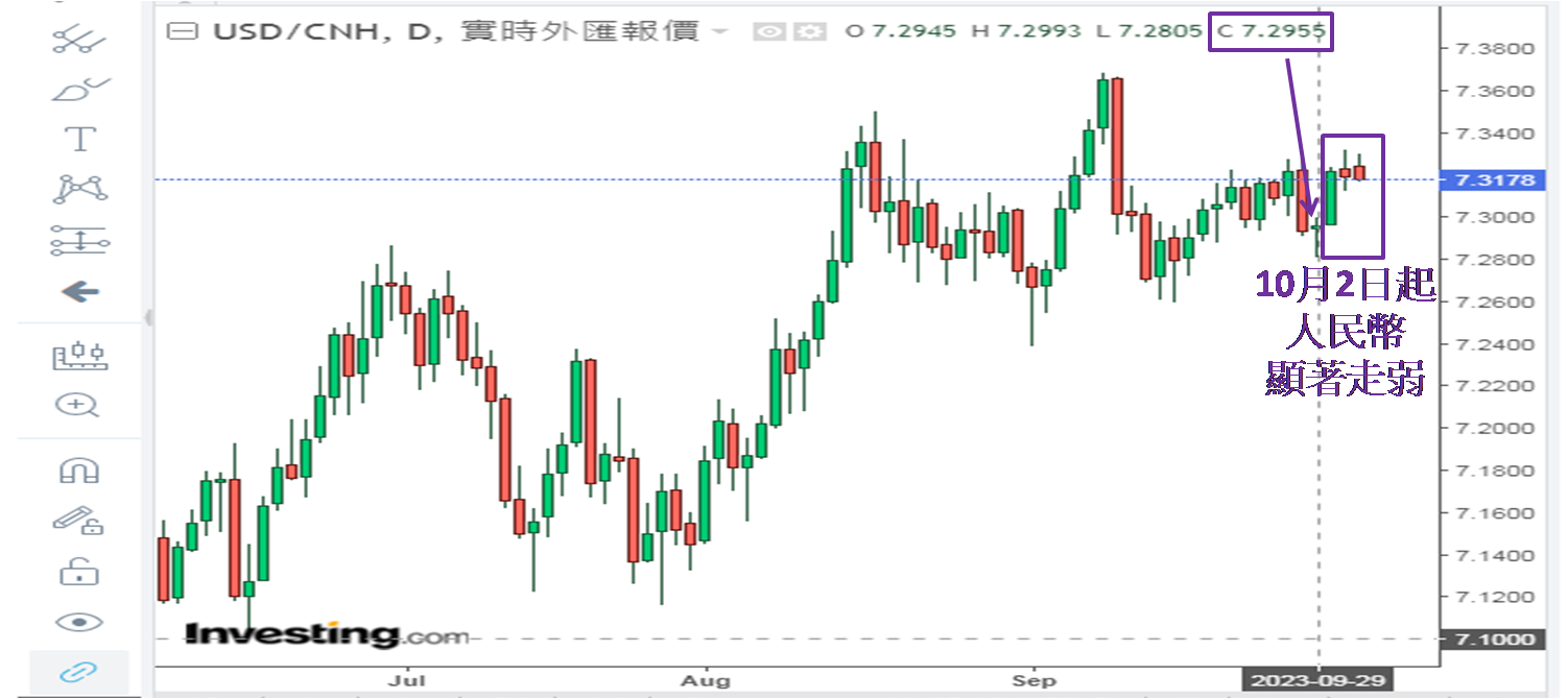 后者则相信是期结后大户早前沽空的正股要平仓带动升幅,故此两次港股造好都应解读为技术性反弹,而非港股重拾升轨讯号。此外,前文命题的上半部写到「人民币走弱短期难扭转」,踏入10月走弱更明显。9月29日起内地开始放「超级黄金周」长假,至10月6日完结,所以美元兑人民币在岸价等到10月9日才复市。不过期内离岸价如常运作,9月28和29日分别收报7.2934和7.2955 (如下图),于9月29日更曾低见7.2805,所以当日港股大升有迹可寻。从处于7.3000以下收市,反映这两天人民币汇率都是稍强。10月2日离岸价却「打回原形」,收报7.3214,与9月27日收报7.3216相若,收高于7.3200是今年人民币的显著弱势水平。