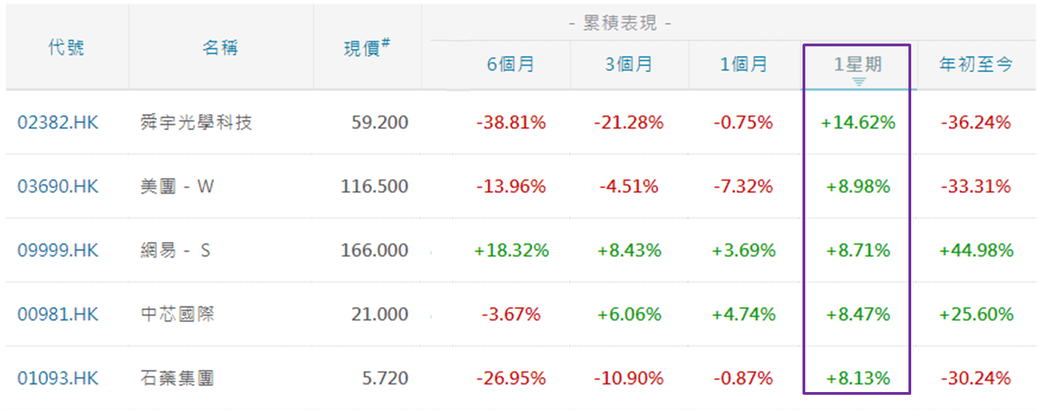 过去一周表现最好五只成份股为舜宇光学科技 (2382)、美团─W (3690)、网易─S (9999)、中芯国际 (0981) 和石药集团 (1093),分别累升14.62%、8.98%和8.71%、8.47%和8.13% (如下图),同见显著升幅,除了石药,其余四股倾向与信息科技相关,相信与近期美股表现有关。自今年6月初以来,纳指未尝收低于13,000点,期指最低收报13,059点,见于10月3日。从10月4日起回升,至10月10日收报13,563点,累升近3.86%。若以10月3日收市位计算,市盈率接近40.30倍。港股科指则自10月5日起回升,至今累升5.33%,跑赢纳指。