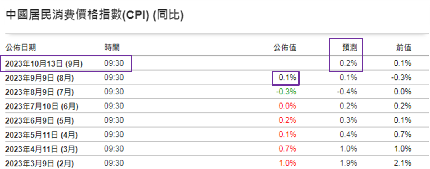 然而,不排除内地为推动第四季经济增长,或会考虑减息,高盛近日发布的最新报告预期在年底前内地下调政策利率10个基点;又表示由于美元强势及国内可能继续放松货币政策,美元兑人民币将面对上行风险。市场关注本周五 (10月13日) 上午9:30内地公布9月份消费者物价指数 (CPI) 及生产者物价指数 (PPI),分别预期为按年上升0.20% (如下图) 和按年下跌2.4%,较8月份相对上升0.1%和下跌3.0%,市场预期内地物价走势会回暖。若乎合预期将有助缓解减息压力,否则要留心恒指本月能否守住17,000点关口。