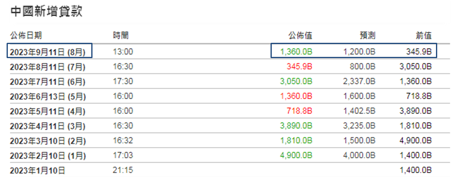 近期人民币走弱,故然与市场对内地和美国的利率走向相反的预期有关;但亦不容忽视不少投资者看淡内地经济前景,加速人民币在9月上旬贬值情况。随着9月11日内地公布8月新增贷款金额约13,600亿元人民币,较7月不足3,460亿元多出超过2.90倍,又较市场预期约12,000亿元 (如下图),多出超过一成,驱散不少看淡内地经济前景的负面情绪,当日开始人民币渐见回升。另可留意此前在9月9日 (周末) 早上公布的内地居民消费物价指数 (CPI),也为人民币回升带来助力,8月数据为0.1%,于7月的-0.3%。