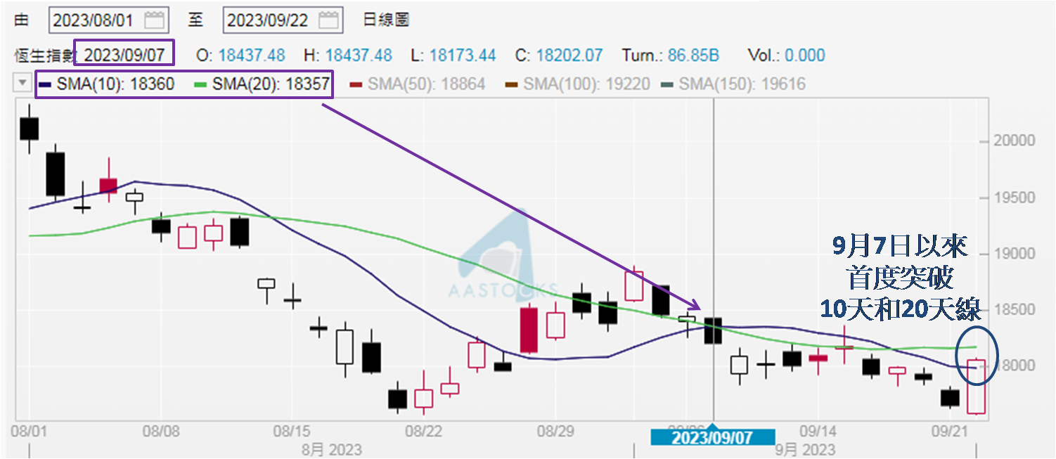 周五收报18,057点,较当日高位18,078点低约20点而已,近乎全日高位收市。周四的高位在17,823点,即18,057点高出超过230点,出现「穿头」,证明上周五港股见近期罕有强势。本身低开77点 (17,655 → 17,578点),最终收报18,057点,倒升超过400点,相距近480点,令恒指自9月18日以来,首度重上18,000点之上收市,亦是自9月7日以来,首度重上10天移动平均线之上收市 (如下图)。不过由于9月15日收报18,182点,因此全周仍累跌125点,已是三周连跌,代表港股单日的强势,不宜视为港股跌势经已被扭转。