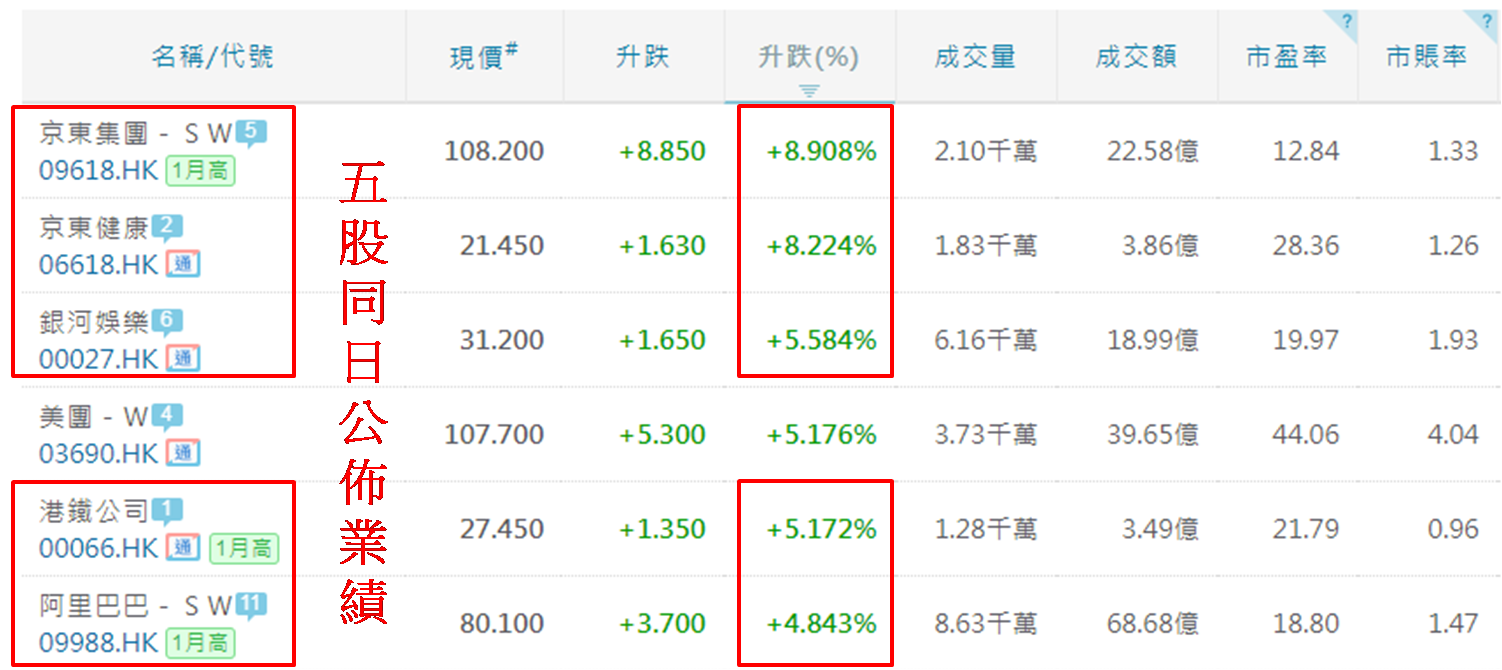 当日升逾4.00%的恒指成份股共九只,其中五只于上周四收市后已公布业绩,一只在周五收市后公布,前五股业绩均胜预期,周五那只亦胜预期,相信这是恒指大升主因。由此推断若本周公布业绩蓝筹股,也见不少胜预期,将成为恒指续升动力。不过若缺乏其他利好因素,预期恒指不会走得太远,诚如8月15日发布市评文章时表示,或许不少投资者于周四等待阿里巴巴─SW (9988) 和京东集团─SW (9618) 要见优秀成绩后才有信心入市。另外,惟见短期有推动内地经济的国策加持,恒指才有条件挑战17,800点或以上。