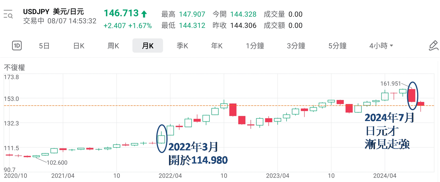 期间由于内地不但没有加息,反而不时减息尝试稳定经济增速,人民币持续贬值,相对美元在岸价累跌12.66% (6.3050 → 7.2193)。值得留意今年7月央行已连番出手,才令人民币稍见走强,若只是计至今年6月底,在岸价报7.2672,人民币贬值幅度扩大至13.24%,所以中资股长期捱沽,从2022年3月初至2024年7月底,上证、恒指、国指和科指分别累跌23.99%、23.73%、24.09%和31.53%,就幅度而言,与上述美股三项指数相若,只是方向相反。而迷思其实在日股之上,美元兑日元于2022年3月初为114.980,相对2024年7月底和6月底为150.030和160.868,累跌23.36%和28.53%。