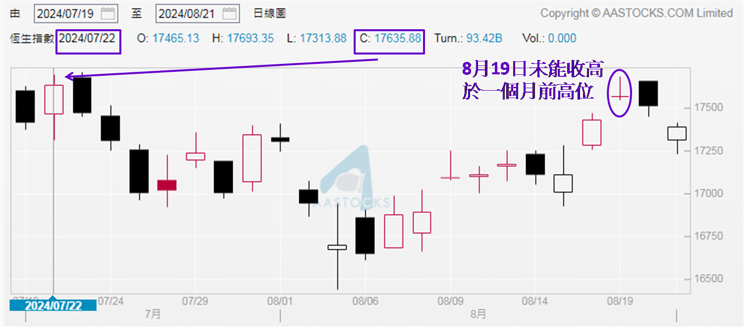 周一 (8月19日) 发布市评文章命题前半部写到「恒指本周关注能否企稳17,500点」,周一至周三恒指分别收于17,569、17,511和17,391点,仅见两日收高于17,500点,昨日走势已见乏力。其实大家毋须对此走势感意外,于8月16和19日恒指上扬之时,相对大市成交金额约1,014亿和944亿港股,隐约见「价升量缩」格局。8月20日恒指回软,成交额约745亿元,即连续两日在减少,并接近8月12至14日于700亿元上落水平,亦是年初至今的交投偏静水平,确认恒指上扬缺力,而从往日恒指走势也可见端倪。