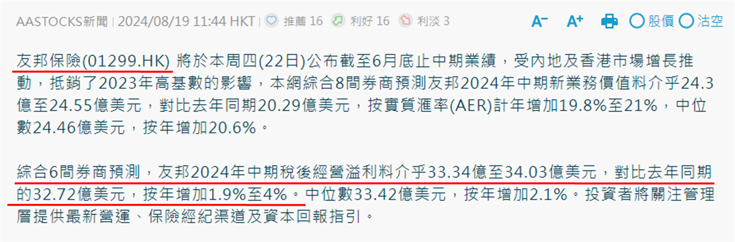 当然,现时还不宜断言恒指短期无力企稳在17,500点之上,多看两天再作定夺为佳。初步看来恒指又要在17,000至17,500点之间整固,仍要留意两只恒指大权重股会公布中期业绩,分别是今日开市前公布的友邦保险 (1299) 和8月28日收市后公布的美团─W (3690)。参考有财经网站综合券商看法,8间券商预测友邦于2024上半年新业务价值介乎约24.30亿至24.55亿美元,较去年同期约20.29亿美元增长约两成。而2023全年新业务价值约42.99亿美元,增长27.76%,所以实数若乎合预期,代表增速有所放缓。
