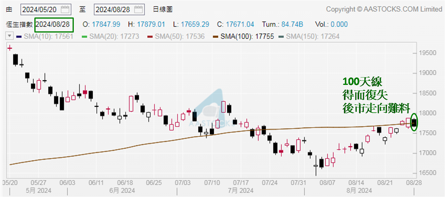 截至下午3:30恒指报17,689点,跌逾180点,令100天线得而复失,所以继阴阳烛形态和大市成交额后,加上与平均线的互动,三者同令恒指走势或见「暗涌」。若简化分析结论,未来两至三个交易日恒指见收高于17,800点,同时大市成交额超过900亿元,方可确立具备续升条件,配合从6月21日以来,最高收报18,293点 (见于7月12日),初步可望升至18,200点水平才遇阻。本周末 (8月31日) 内地公布8月官方PMI,制造业预期为49.2,稍低于前值的49.4。若乎合预期,为3月以来最低,为9月港股开局带来考验。