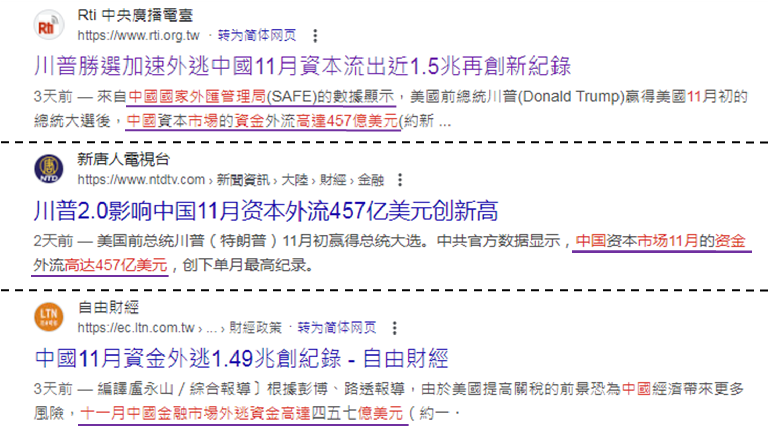 就如今次,问到「最新数据显示,11月中国金融市场外逃的资金高达457亿美元,创史上单月最高,比10月的外流资金258亿美元规模扩大,这是否反映外资投资人对中国经济的信心疲弱?」表面看来数据来自国家外汇管理局,实则是自行计算11月较10月的银行结汇顺差及跨境收支顺差变化的合计数字,却被「硬扯」至有大量外流从中国金融市场外逃的现象。绝大部分外媒引述以上消息,均无列明数据源,笔者看了多则报导,才见数据源是国家外汇管理局,不过严格来说该局并无公布457亿美元或258亿美元的金额,只是有外媒恣意堆砌数据而「硬扯」出一个她们期望公众看到的结果而已。