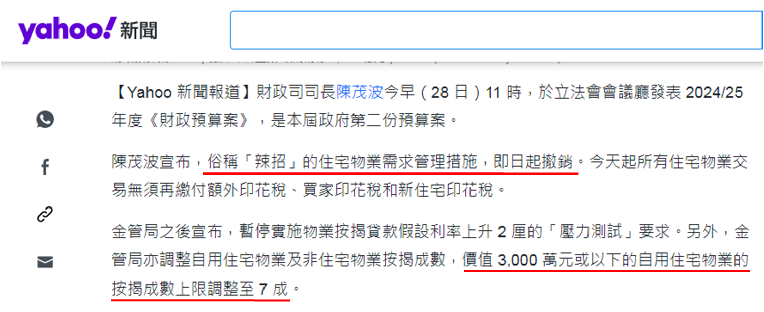 昨日 (2月28日) 多只本港地产股见上扬,其中恒基地产 (0012) 及新世界发展 (0017) 分别上升3.83%和2.86%;领展 (0823)、太古地产 (1972) 及信和置业 (0083) 也升逾1.00%,相对为1.96%、1.52%和1.44%;至于恒隆集团 (0010)、新鸿基地产 (0016)、君鹰 (0041) 和九龙仓置业 (1997) 等亦见上扬;而从是地产代理的美联集团 (1200) 升幅更是惊人,超过33.00%,跻身主板升幅榜五甲之列。上述多只本地股份造好,受惠于昨日早上港府发表的2024/25财政年度的财政预算案,俗称「辣招」的住宅物业需求管理措施,即日起撤销,所有住宅物业交易无须再缴付额外印花税、买家印花税和新住宅印花税。