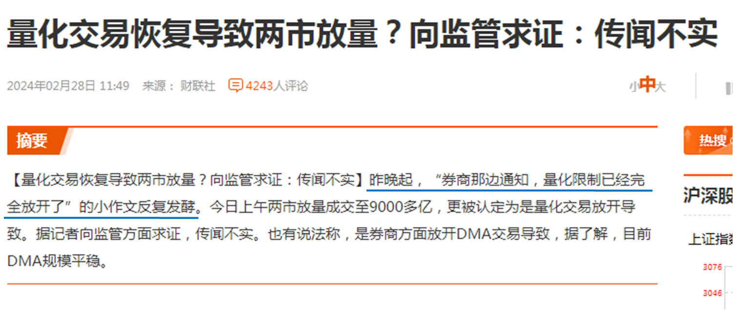 昨日开市首小时上证指数渐见上扬,高见3,031点,升幅0.53%;但约15分钟便倒跌,并见跌幅不断扩大,下午3:00收报2,957点,正是全日低位。消息面在前晚 (2月27日) 有命题为「券商那边通知,量化限制已经完全放开了」的文章流传,令沪深两市交投突然活跃,上午两市成交金额共逾9,000亿元人民币,更被认定为是量化交易放开导致。「量化交易」被视为之前内地股市多次闪崩主因,所以昨日A股下挫有迹可寻。不过有内地媒体向监管方面求证,得到回复是传闻不实,相信上证指数在未来两至三个交易日,会重上3,000点关口之上。