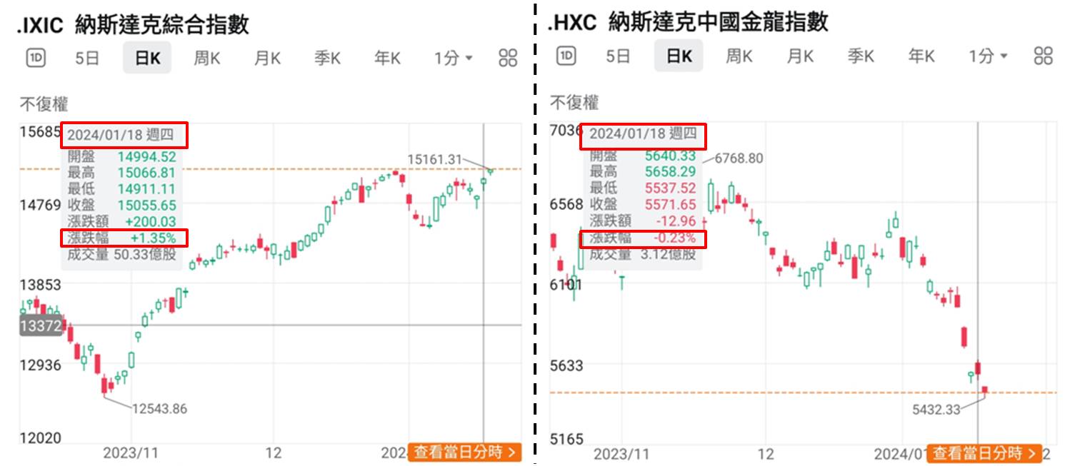 不过就算数字乎合预期,只能带动下周港股造好,至于本周则没有公布数据左右港股走向,但也未必跟随美股表现。以上周五港股表现为例,隔晚美股三项主要指数道指、标指和纳指同见上扬,升幅均逾0.50%,纳指更达1.35%;可是反映美国上市中概股表现的金龙指数却跌0.23%,而该指数的五大市值成份股均为新经济股,指数表现依然未有受惠于纳指显著造好带动。此外,香港时间截至1月19日晚上11:30,纳指再升0.44%,金龙指数再跌2.23%,继续走向相反,可见美股和港股正在个别发展。