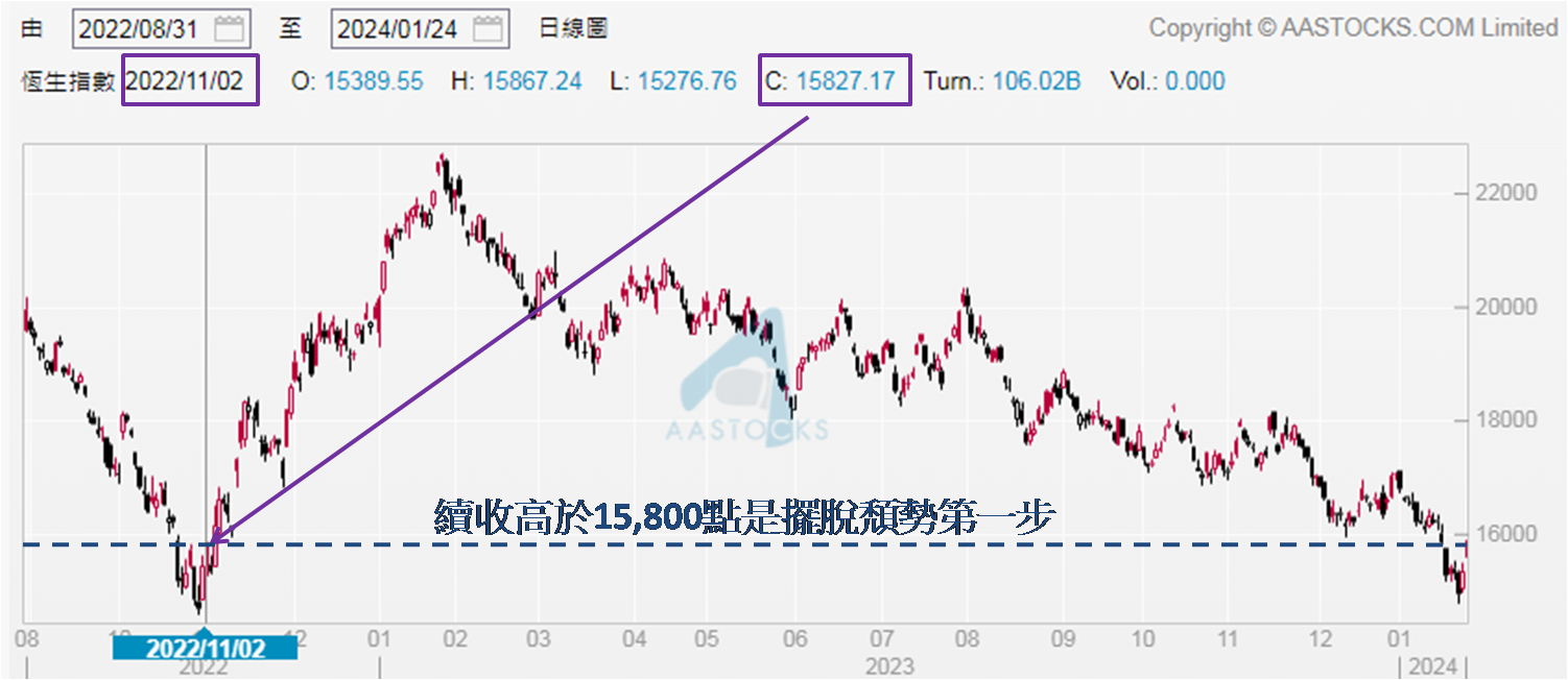 恒指处于罕见低水平,与2022年11月初一样见「V形」反弹不无道理。不过暂见力度不及上回,当时恒指两日累升逾7.76% (14,687 → 15,827点),今次仅逾6.27%。无独有偶两次反弹均收高于15,800点,为今次续升带来曙光;但未来两个交易日走势非常关键,上回反弹两日后恒指回调近490点,再于翌日重拾升轨,大升逾820点,收报16,161点,继而便一直保持在16,000点之上。故此笔者认为即或今日 (2024年1月25日) 因获利盘出现令恒指见跌,像上回一样调整近500点也不代表升势就此完结。