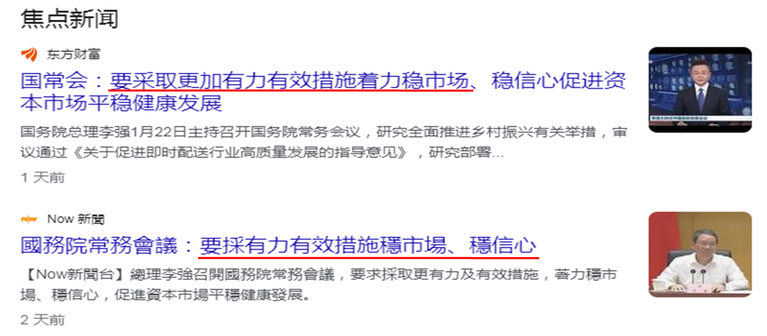 彭博报导内容为引述消息人士指,官员正研究动用约2万亿元人民币,主要来自国有企业的离岸资金,作为平准基金一部分,买入在岸股份。据报国内亦至少动用3,000亿元,透过中国证金或中央汇金,投资在岸股份。此外,员亦正考虑其他措施,若获得最高领导层核准,最快本周公布,但强调这些计划仍有可能改变。笔者留意报导内容与周一国家总理主持国务院常务会议提及的观点具一致性,要进一步健全完善资本市场基础制度,更加注重投融资动态平衡;要采取更加有力有效措施,着力稳市场和稳信心。