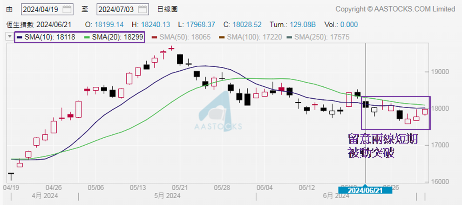 上月恒指的升市撑到最后两个交易日终告失守,总结6月累跌361点,跌幅2.00%,收报17,718点,18,000和17,800点近期两个重要位置同见跌破。不过6月最后一个交易日是升市,紧接7月首两个交易日升势保持,在三连升后恒指累升逾260点,昨日 (7月3日) 收报17,978点,为6月27日以来最高收市位。虽见7月开局走势不俗,但应留意期内高位见于7月3日的18,017点,与10天移动平均线现时位置相同,代表此线仍未见上破。此外,自6月20日起恒指便收低于20天线,现近18,100点,认为恒指要见同时上破两线,现时的「上落市」格局才有望打破。可是就算两线均见上破,亦不宜对后市走势太早感乐观。