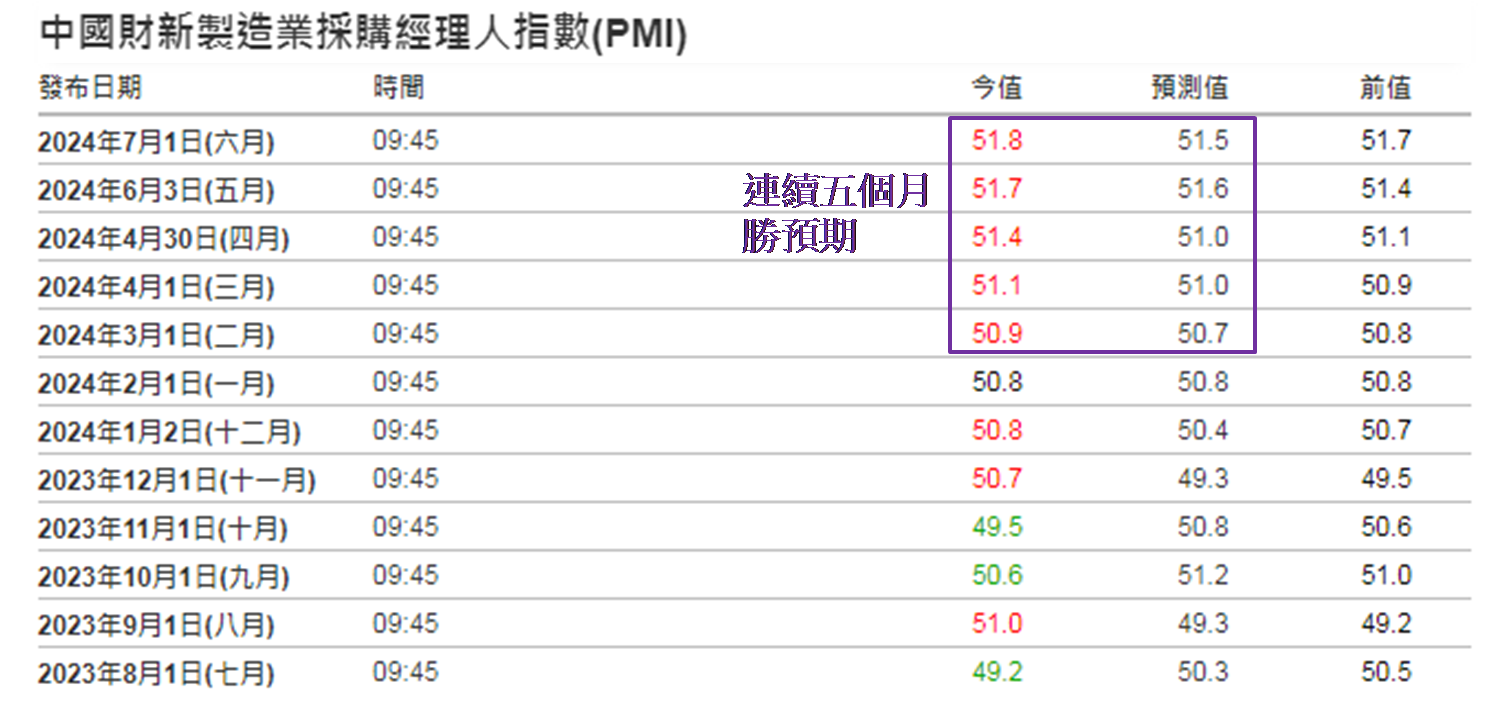6月值为50.5,是自2023年1月以来历时达一年半高于50.0的盛衰分界线,反映服务业持续处于扩张状态。然而,50.5是今年暂时最低数字,差过市场预期的51.1,亦是连续三个月数字下跌。再看昨日公布的财新PMI,服务业的6月值为51.2,是去年11月值以来最低,并较预期的53.4见明显差距。数值欠佳为何恒指昨日上升近210点呢?笔暂相信与制造业PMI表现有关,6月值为51.8,胜预期的51.5,连续五个月公布值胜预期,并且为2021年6月值以来最高,即创三年新高。市场普遍认为内地的官方PMI主要反映大型企业行情,财新PMI则主要是中、小型企业行情,故此两者数值出现背驰实在并无矛盾。