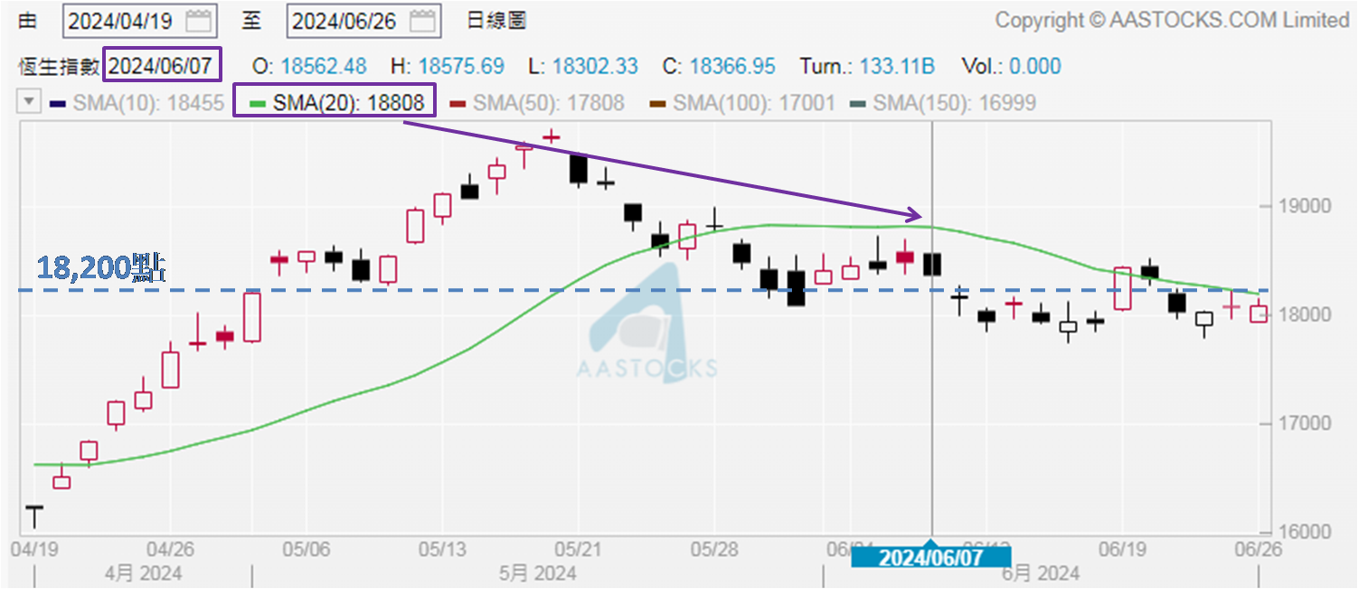 自6月19日恒指升逾500点,收报18,430点,至今保持在18,000点之上收市,已有六个交易日,理应看为18,000点已见支持。然而,上述的18,430点经已是期内最高收市位,介乎18,430至18,027点,并有下移迹象。自6月21日至今收市位未尝重上18,100点或以上,意味着近日恒指收市位只是徘徊在万八关口高数十点,所以单日若见较大跌幅,短期再度失守此关口并非没有可能,暂不宜对后市走势掉以轻心。20天移动平均线现处18,200点水平,至少见连续两天收高于18,200点,才能视为具备上扬条件。