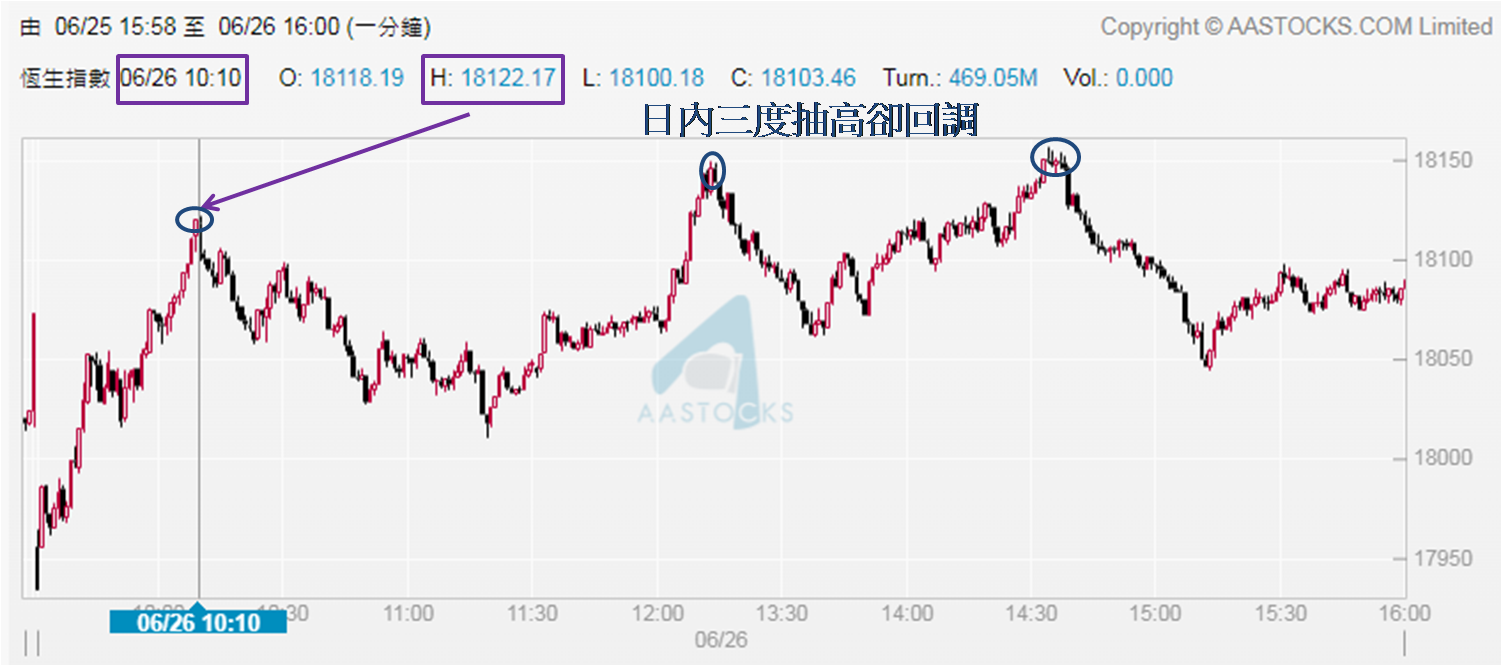 恒指开报17,934点,回到18,000点以下,便一直高走,上午10:10高见18,122点,期内约70分钟高走近190点;但紧接恒指回落,至上午11:19低见18,011点,用了约70分钟回到18,000点水平;之后恒指再度上扬,于下午1:13高见18,149点,又抽高近140点,然而到下午1:38低见18,061点;该分钟恒指又一次发力上扬,于下午2:34高见18,156点,及后又一次下行,到了下午3:13低见18,044点。短短一日三次抽高至18,120点之上,之后都回到18,000点水平,证明「托价」无助恒指摆脱现时弱势,现时港股最需要的,是被市场认同的上扬原因。