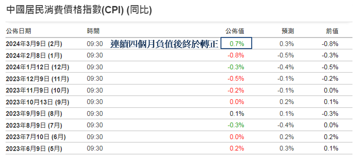 从环比来看,去年12月CPI经已转正,由 -0.5% 至 0.1%,并于今年1月和2月分别录得 0.3% 和 1.0%,物价增速正在加快。此外,扣除食品和能源价格的核心CPI同比上涨 1.2%,涨幅比上月扩大0.8个百分点,为2022年2月以来最高涨幅。由此可见,多项与物价相关的数据,支持内地消费行情在回暖,这明显受惠于春节期间食品、出行和文娱消费需求大幅增加所致。不过内地下一个消费旺季为五一黄金周假期,所以预期3月和4月CPI数据应为 0.5%或以下,约一个月后会公布下次CPI,所以现时中港股时利好氛围,应可维持两至三周。