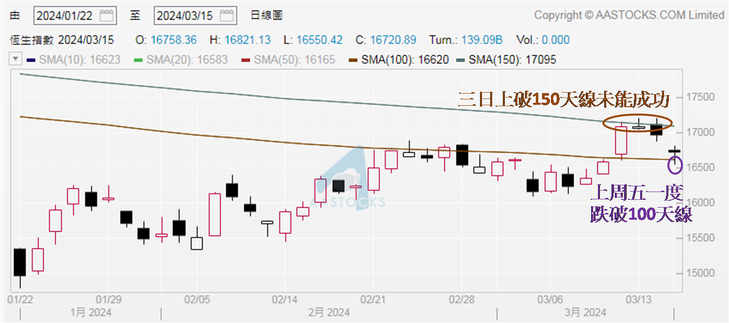 就技术走势而言,周二至周四高位均在150天移动平均线之上,却收在其下,反映此线是近期重要阻力位参考之一。另看100天线,虽于上周五恒指低见16,550点,处于此线 (16,620点) 以下,犹幸下午开市约半小时后跌幅渐见收窄,收复约170点,最终下跌240点,收报16,720点,继续守住100天线收市,从上周二计起已踏入第四天,理应已成支持位。然而,笔者认为后市还不宜掉以轻心,于3月11日发布市评文章的命题写到「忧虑多个中国产业受制裁」,其中提到美国参议院针对中国生科企业的《生物安全法案》于美国时间3月6日获通过。