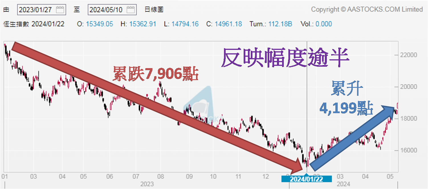 自今年1月23日起港股回升,至上周五 (5月10日) 高见18,993点,距离万九关口仅一步之遥,约三个半月反弹逾28.00%,由于超过两成,市场解读为出现「技术性牛市」,视为在熊市当中的一次反弹而已。而上回「技术性牛市」,见于2022年10月31日低见14,597点,至2023年1月27日高见22,700点,累升8,103点,升幅达55.51%。不过若以2021年2月18日高见31,183点计起,至14,597点是累跌16,586点,所以上述累升8,103点实则反弹幅度还不到一半。至于去年7月底高位和今年1月下旬低位比较,累跌7,907点。