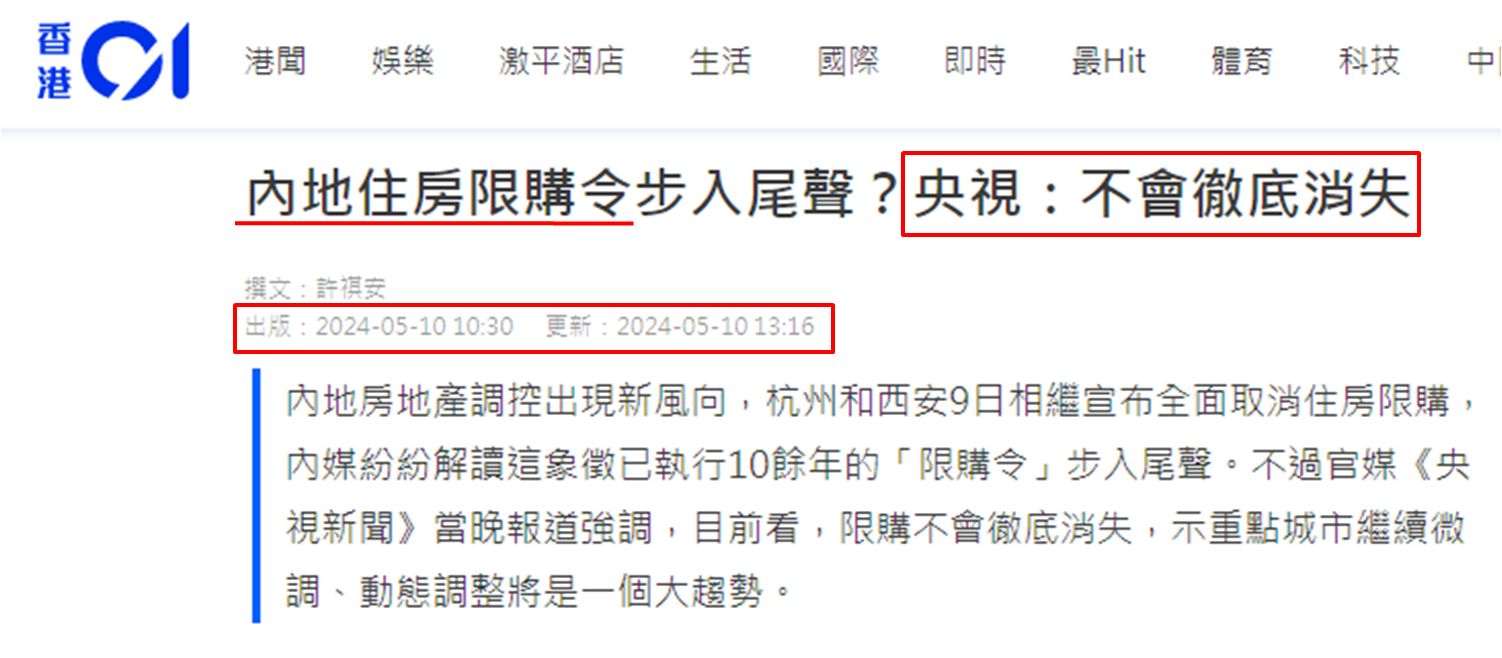 杭州和西安均在5月9日相继宣布全面取消住房限购,根据内媒《时代财经》大概统计,原本执行内房限购有四十多个地方,如今除了海南省外,仅剩北京、上海、广州、深圳四个一线城市和天津仍有限购政策。而《央视新闻》于同日晚间报导虽表示「限购不会彻底消失」,同时亦表示「限购松绑目前看是大势所趋」,是否仍有城市要执行限购政策,取决于有否迫切需要实行「因城施策」、「一城一策」所导致。除了此消息,外媒引述消息内地考虑减免「港股通」股息税,市场解读内地投资者购入高息股的意欲增加,从而提升港股交投活跃度。