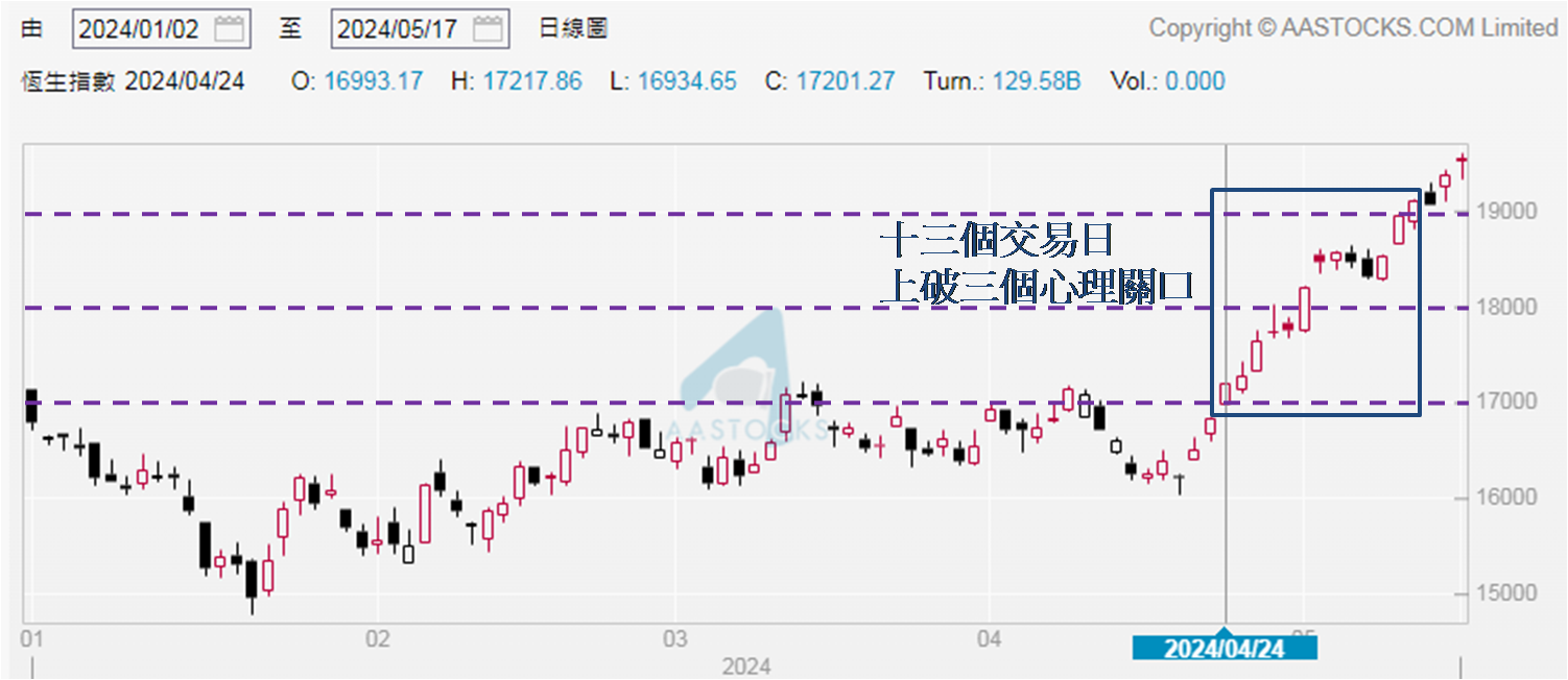上周五恒指收市位也见启示性,报19,553点,收高于19,500点关口,并为去年8月2日以来最高。回顾当时于7月31日高见20,361点,继而恒指展开漫长跌势,历时接近半年,至今年1月22日低见14,794点后走势才渐见回顺。现时恒指重上去年8月初水平,意味着回到当时跌势的起点。留意去年7月31日和8月1日分别收报20,078和20,011点,同见在20,000点之上,而自去年5月9日至今超过一年,只有三日收高于20,000点,另一次见于去年6月16日的20,040点。三次都是轻微高于20,000点,证明恒指要企稳在20,000点之上不容易。自今年4月24日收高于17,000点后,分别于5月2和13日相继突破18,000和19,000点收市,在短短十三个交易日上破三个心理关口。