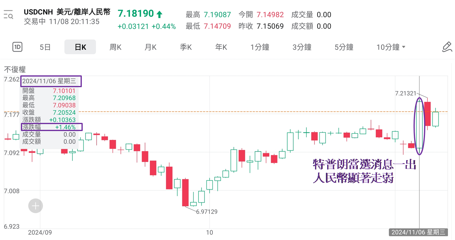 香港时间上周三市场见特朗普成为下任美国总统尘埃落定,人民币显著走弱,美元兑人民币离岸价收报7.20524,大跌近1.44%。之后人民币虽有所回升,实则表现反复,周四升0.76%,周五截至下午6:45又跌0.33%,报7.17415,仍较周二收报7.10162低逾1.00%。特朗普胜选引发市场「连琐推测」,认为特朗普上任后会大力推动美国经济增长,又会掀起新一轮贸易战,引发美国通胀飙升,于是联储局考虑放慢减息步伐,甚至存在重新加息的可能性,所以近日美元走强,令人民币以外,如日元、欧元和英磅等外币同见走弱。