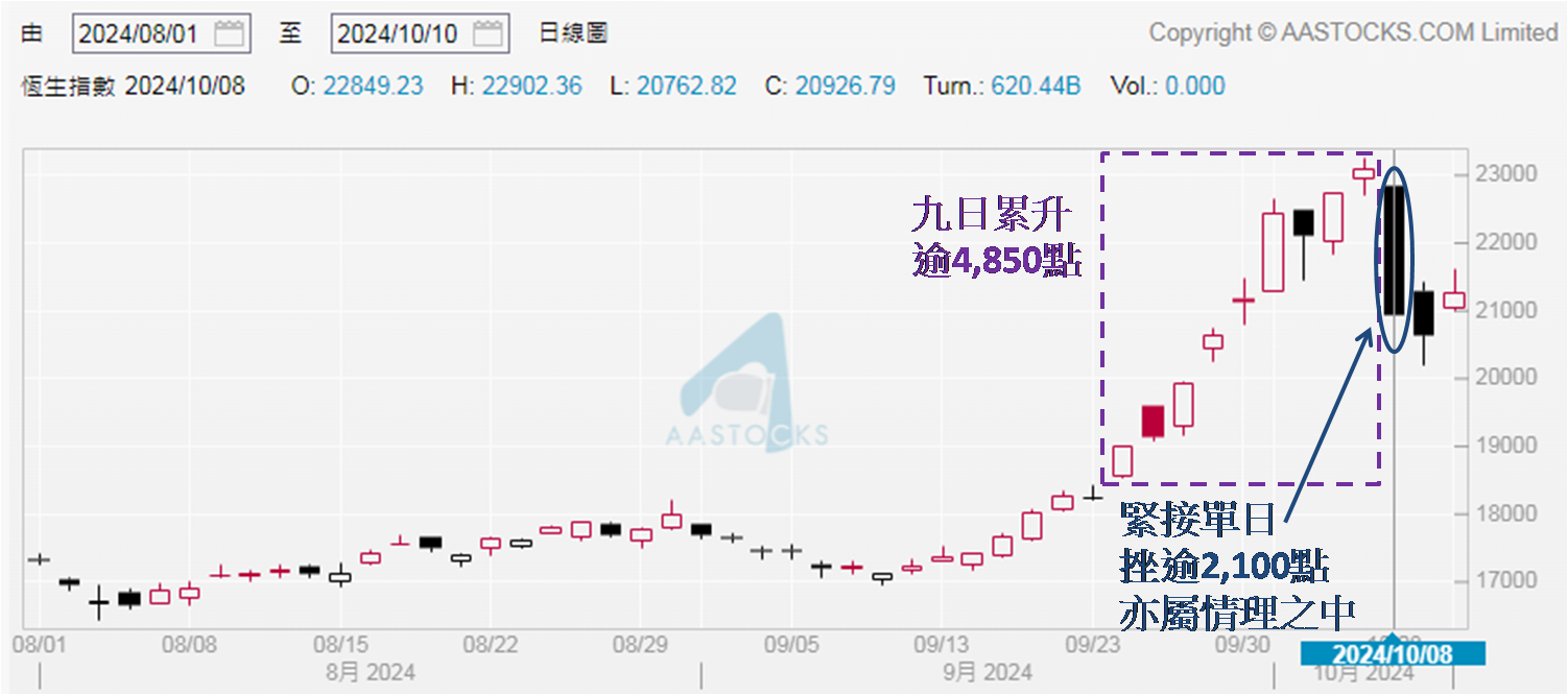 诚然在过去接近廿五年的日子,恒指单日挫逾9.00%极为罕见,不过也该留意自9月24日因国策消息刺激恒指当日升逾4.10%,为今年5月22日后再度重上万九关口收市,至10月7日收报23,099点,二万三关口亦见上破,短短九个交易日累升逾4,850点,升幅近26.60%,所以后来单日挫逾2,100点,还不到之前累升的一半,应理解为升势被窒碍,不非视为升势已被破坏。另可留意大跌后紧接两日表现,先是跌近290点,上周四 (10月10日) 则反弹近615点,于全然收复周三跌幅后更倒升325点。