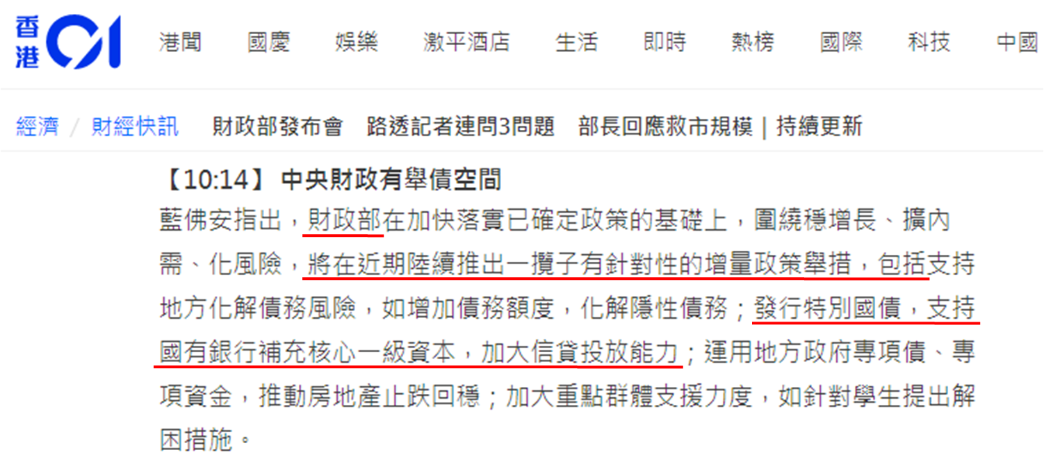 其实就着早前9月24日至10月7日累近逾4,850点,中位数见于20,673点,上周三收报20,637点低了不足40点,所以上周四恒指假若再跌,意味着逾半升幅被蒸发,才会视为升势结束讯号出现。实则上周四收于21,251点,较上述中位数高出接近580点,所以现时断言恒指无力续升言之尚早。当然国策消息主导近期港股表现,上周四恒指反弹近615点,当日消息面见人民银行正式推出证券、基金、保险公司互换便利,同日开始接受合资格金融机构申请,首阶段规模为5,000亿元人民币。