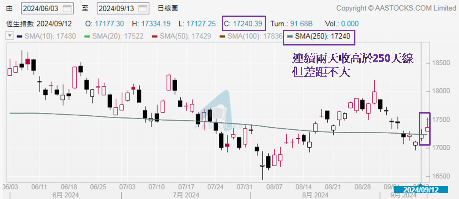 当然,9月9日为恒指服务公司一系列指数成份股换码的生效日期,理应前一个交易日收市后便进行调节,不过9月6日是「风假」,推迟至9月9日才进行,所以当日超过1,300亿元的成交额,对照当日下午3:59至4:10之间录得成交额约192亿元,扣除成份股换码因素后成交额约1,100亿元,由此推断短期恒指若要企稳在17,500点之上,按周计的日均成交额需要不少于1,000亿元。另想指出恒指于上周四和周五虽均收高于250天移动平均线 (又称「牛熊分界线」);但仍不宜视为港股走势经已转强。皆因上周五收报17,369点,较250天线为17,237点仅高出约130点,少于200点显然差距依然偏小,本周随时此线又见得而复失。