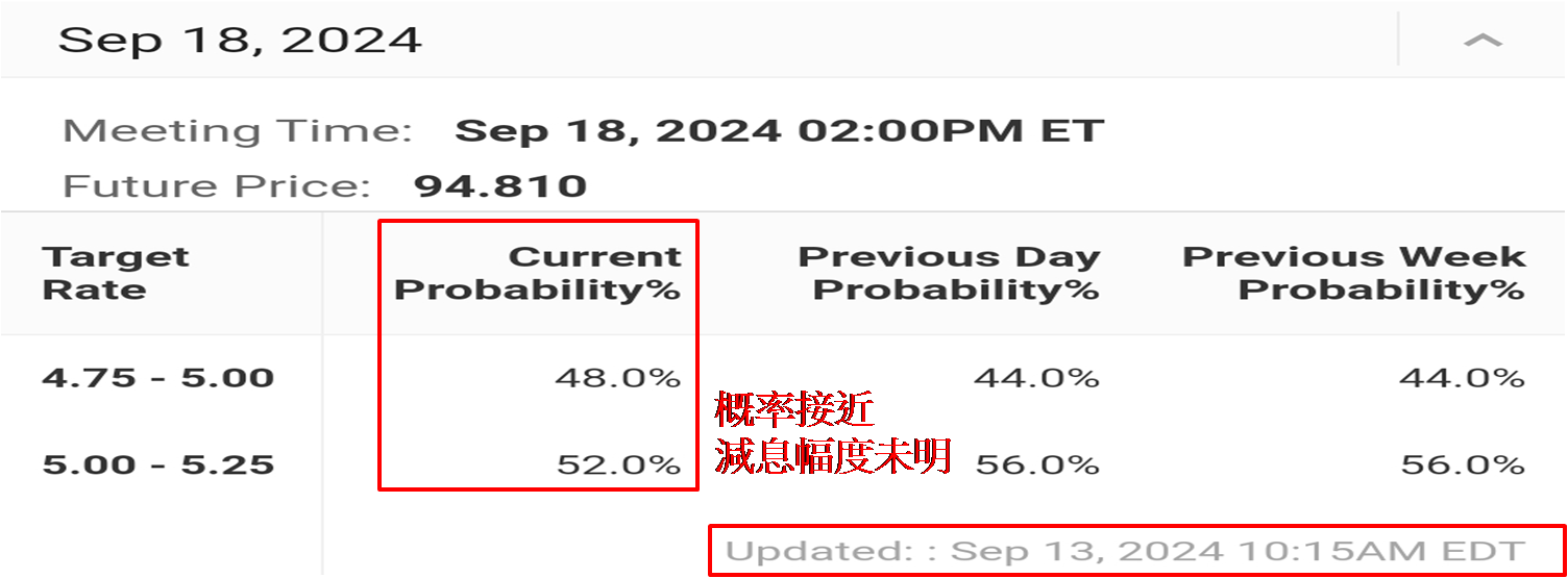 另可留意上周五恒指虽曾冲破17,500点,高见17,540点,不过全日处于17,500点之上还不到20分钟。上述高位见于上午10:21,之后恒指便持续下行,至下午2:39低见17,357点,为上午9:33以来的低位,从高位回落逾180点。而17,357点与收市位17,369点相距又仅约10点,无异于近乎上午9:33以来的低位收市,充份反映上扬乏力。究其原因现时中港自身缺乏利好消息,加上美股表现反复,受着美国近期发布经济数据好坏参半影响。美国时间截至9月13日上午10:15,距离9月18日联储局议息不足五日,利率期货预期减息1/4和1/2厘的概率分别是52.0%和48.0%,而早前于9月9日发布市评文章时表示9月6日相对概率为70.0%和30.0%,预期减息1/4厘概率锐减。