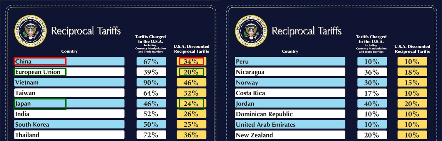 另外,若由去年12月高位20,204点计起,纳指至今累跌近23.00% (20,204 → 15,587点),超过20.00%技术上已进入熊市区。至于反映美国上市中概股表现的纳斯达克中国金龙指数两日累跌10.60%;恒指ADR上周五则折合收报21,448点,单日跌幅达5.86%,下跌超过1,300点,意味着今日 (4月7日) 港股表现大受考验。目前环球主要股市见振荡,皆因美国在当地时间4月2日下午4:00公布对全球实施的「对等关税」措施 (于4月5日生效),向所有输入美国的商品征收10%基准关税;并对数十个贸易逆差较大国家或地区开征更高税率,其中包括部分与美国关系密切的G7国成员,日本为24%,欧盟 (适用于德国和法国) 为20%。