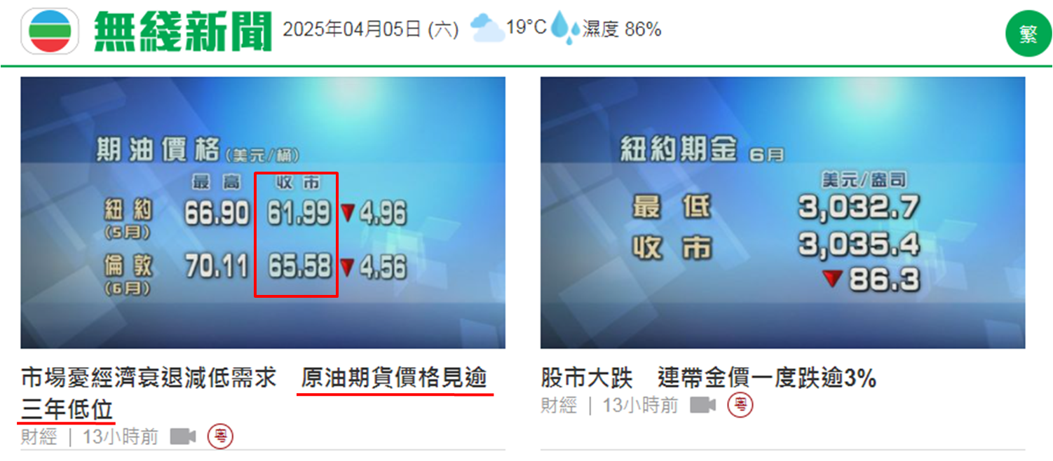 加拿大虽不在「对等关税」名单,但之前宣布对其征收25%的关税依然适用。美国总统特朗普上任约两个月连翻打出「关税牌」,部分盟友亦感不满,有反制措施安排,加拿大宣布对所有不符合「美墨加协议」的美国进口汽车征收25%的关税;欧盟则表示正在最终确定一项针对美国钢铁关税的响应措施,并准备与美国谈判,若失败将采取进一步的反制措施。实施「对等关税」宣布后,投资银行摩通预期美国经济今年会陷入衰退,对今年GDP增长预测由增长1.3%,改为收缩0.3%。市场预期环球能源需求减少,纽约期油和伦敦期油于上周五分别大跌7.41%和6.50%,收报61.99和65.58美元,同为2021年8月23日以来最低,事隔逾三年半。