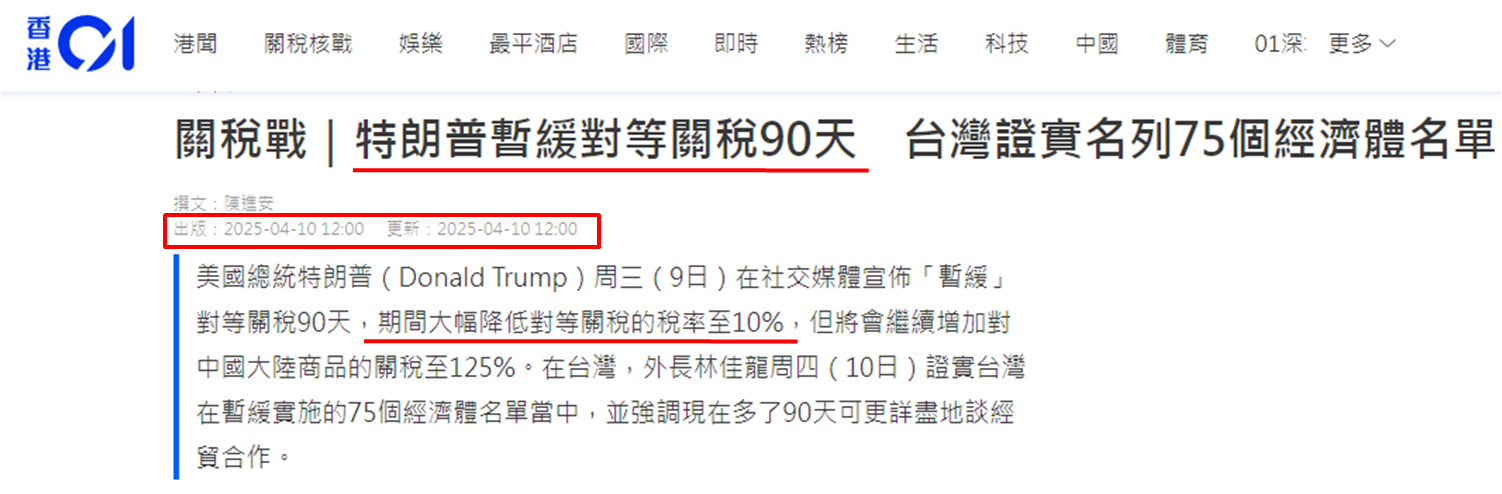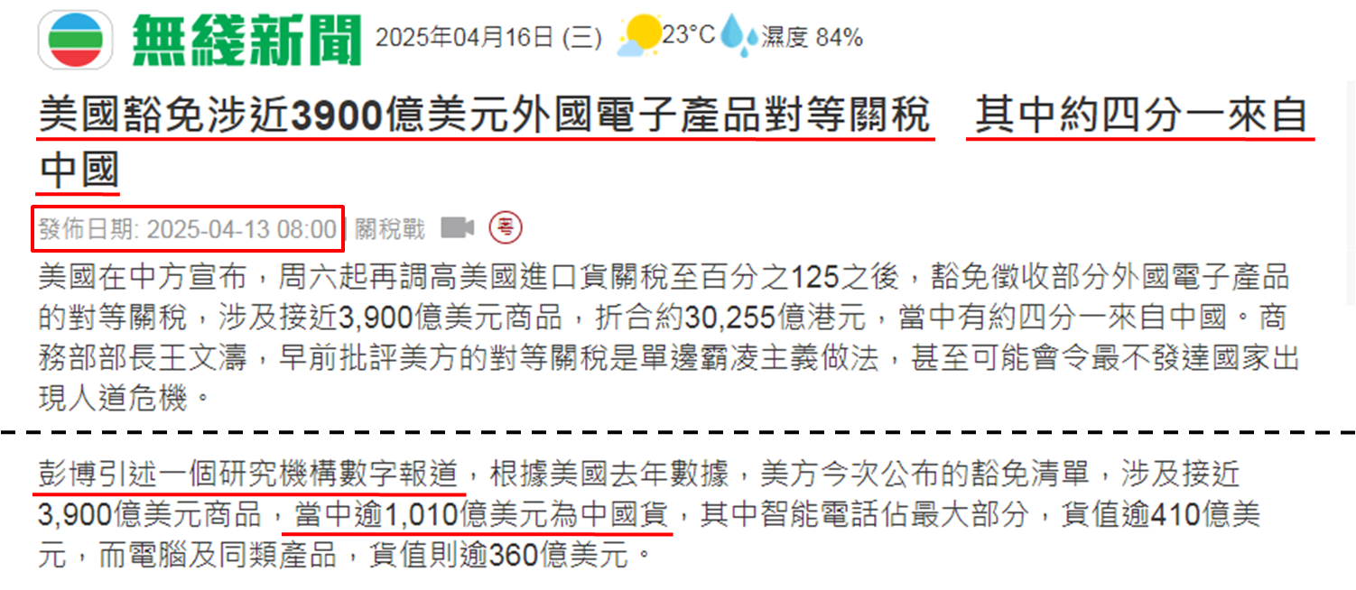因着现时进口美国的中国货品关税为145%,市场认为进一步增至245%,分别不大,毕竟145%的惊人税率已将中国货品拒诸门外,再加税率亦属数字游戏而已。另外,美国上周宣布豁免部分电子产品「对等关税」(包括中国货品),涉近3,900亿美元商品 (当中约1/4来自中国,逾1,010亿美元),市场以为松一口气之际,特朗普却于美国时间周日 (4月13日) 晚在总统专机空军一号上预告,将会有针对半导体和芯片等的关税措施,详情在两周内 (over the next week) 公布。