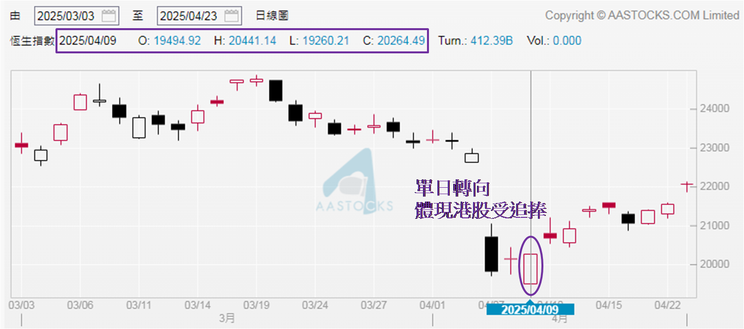就着目前港股走势,较受美国对华实施「对等关税」消息影响前,于4月3日恒指收报22,849点,相距不足800点,证明此消息对股市的负面影响已接近被完全消化。因着自2月7日大市单日成交金额上破2,000亿港元后,至今超过两个半月保持交投活跃水平,所以虽于4月9日恒指一度低见19,260点,日内最多跌近870点,却迎来大量趁低吸纳买盘,最终倒升近170点,收报20,264点。从1月24日至今历时三个月,除了4月7日,恒指一直收高于20,000点,未尝回到1月20日内地AI大模型DeepSeek面世前的19,600点以下水平。