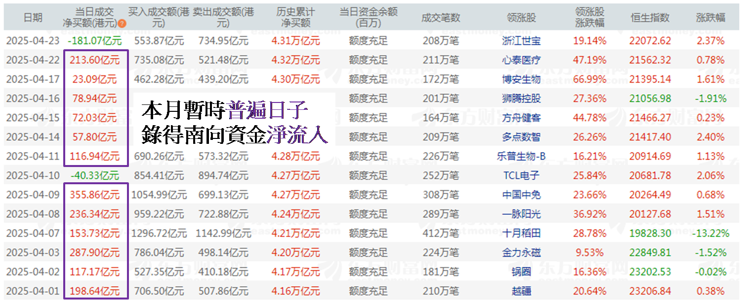 年初至今历时超过三个半月,暂只见1月24日、2月5、11、13、20日、3月4、11、18、20日,以及4月10和23日共十一日,录得「港股通」南向资金净流出,期内共七十一个交易日,净流出日子占比约15%而已,反映今年以来港股在内地投资者心目中一直具吸引力。目前内地投资者对港股热情转淡机会不大,保守而言,至少本月余下日子港股能保持单日成交额不少于2,000亿港元的活跃水平,为港股带来续升动力。现时市场憧憬中美短期内会进行贸易谈判,美国总统特朗普更表示两国会在协议达成后大幅下降对华关税,为昨日恒指大升逾500点主因。