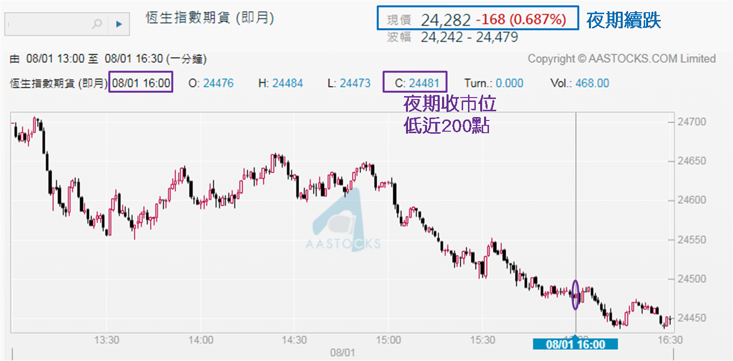 诚如7月31日发布的前市评文章,文末表示可对恒指走向有两手准备,其中一种情况是倘见恒指续跌,要有回调幅度较大的心理准备。参考7月8日以来恒指渐见上扬,当时恒指主要波幅区间介乎23,800至24,100点之间,意味着若见连续两天收低于25,200点,恒指于24,100点才见较大支持,即较7月30日收25,176点,下行空间是超过1,000点。上周五收报24,507点,较25,176点已低近670点,恒指正在步向24,100点显而易见。另可留意周末夜期收报24,282点,再跌168点,若以上周五下午4:00计起,跌幅更是接近200点。