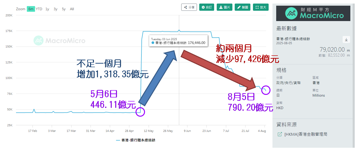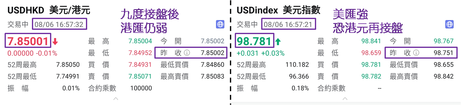 周一 (8月4日) 发布市评文章时表示,港汇再度触及弱方兑换保证,于7月31日港股开市前和8月1日港股收市后,金管局两度又要接港元沽盘。从6月26日计起,约一个月已八度接盘 (令银行体系结余降至790.20亿港元)。其中向坏方面解读,不排除港汇仍有走弱可能,倘再触及弱方兑换保证,港股要进一步「捱沽」。而前文发布仅一日后,港汇的确又一次触及弱方兑换保证,于8月5日港股开市前金管局第九次接盘,令银行体系结余降至724.61亿元,较5月初触发强方兑换保证前,银行体系结余为446.11亿元,差距收窄至278.50亿元。
