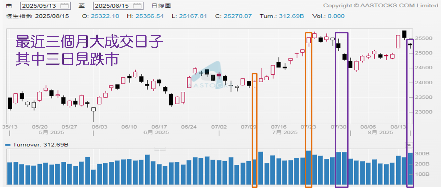 值得留意上述五日高成交日子,其中三日遇上跌市,并且就是最近三次录得高成交日子,分别是7月30、31日,以及上周五 (8月15日)。看到上周四及周五恒指表现,大家若再回看笔者于8月14日发布的市评文章,相信有另一番感觉。文章惯常在当日开市前,或是前一晚发布,那时读到前文,或许有人会认为笔者看错恒指走向,错过入市时机,文中的「心得分享」内容只是给予大家一点安慰而已。前文表示不论大盘突然见大升或大跌,投资总是要冷静部署,并写到见大升时心急追高,切入位倾向不利,恒指稍见回调已要「捱价」守候。