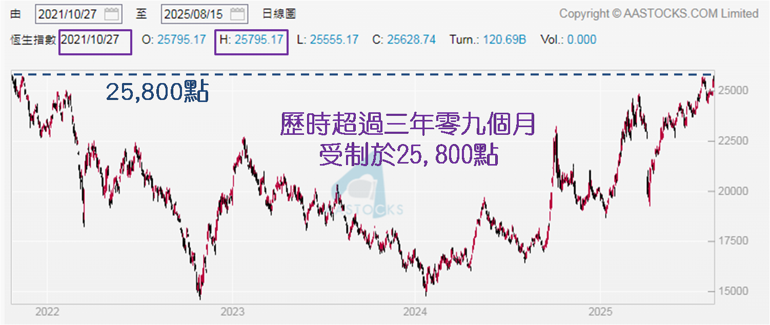 至于来到8月13日恒指收报25,613点,较7月16日收报24,517点,已累升近1,100点,自然呼吁大家要冷静。于8月14日的市评文章写到「本月要上破25,735点应无悬念。惟要留心自2021年10月27日以来,高位见于当日的25,795点,意味着距今历时超过三年零九个月,恒指一直受制于25,800点;至于期内最高收市位,见于2021年11月16日的25,713点,期内惟一收高于25,700点的日子,所以认为8月14和15日的恒指走势很关键,倘见续升关注能否高位上破25,800点,以及收高于25,700点,当然收高于25,713点则更佳。」
